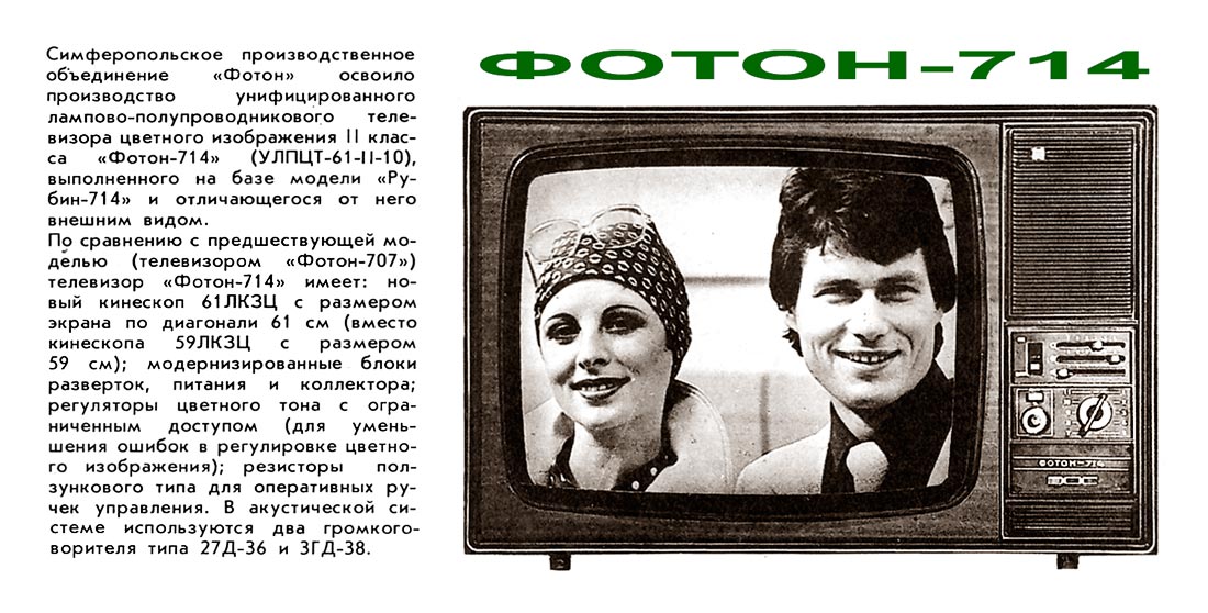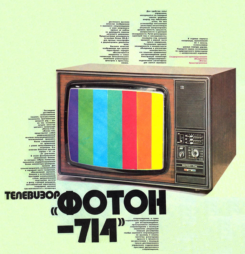 Телевизионный приёмник цветного изображения *Фотон-714/Д* с начала 1977 года выпускал Симферопольский завод телевизоров им. 50 летия СССР. Телевизор **Фотон-714** - это унифицированный (УЛПЦТ-61-II-11/10) лампово-полупроводниковый телевизионный приёмник, предназначенный для приёма программ телевизионных студий в цветном или чёрно-белом изображении в диапазонах МВ и ДМВ (индекс Д). Полоса воспроизводимых частот 80...12500 Гц. Номинальная выходная мощность канала звука 2,5 Вт. Потребляемая мощность 250 Вт. Габариты телевизора 770х550х545 мм. Вес 60 кг. Основные характеристики Тип: Унифицированный лампово-полупроводниковый цветной телевизионный приёмник (УЛПЦТ-61-II-11/10). Производство: Симферопольский завод телевизоров им. 50-летия СССР. Начало выпуска: С начала 1977 года. Приём: Телевизор предназначался для приёма программ телевидения в цветном и чёрно-белом изображении. Диапазоны: Работал в диапазонах метровых волн (МВ) и дециметровых волн (ДМВ) — на что указывает индекс «Д» в названии. Размер изображения: 482 х 362 мм. Чувствительность: В диапазоне МВ — 50 мкВ. В диапазоне ДМВ — 110 мкВ.