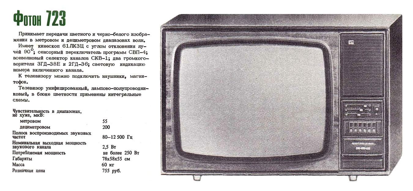 Цветной телевизор *Фотон-723* с начала 1979 года выпускал Симферопольский завод телевизоров. *Фотон-723* (УЛПЦТИ-61-II-13) унифицированный лампово-полупроводниковый телевизор цветного изображения 2-го класса с применением микросхем. Телевизор работает в МВ и ДМВ диапазоне. Переключение 6-ти заранее настроенных программ - сенсорное. Характеристики Производитель: Симферопольский завод телевизоров. Год выпуска: с I квартала 1979 года. Класс: 2-й (унифицированный лампово-полупроводниковый). Тип: Цветного изображения. Диапазон частот: МВ и ДМВ. Переключение программ: Сенсорное (6 программ). Разрешающая способность: 450 линий. Чувствительность: МВ — 55 мкВ, ДМВ — 200 мкВ. Выходная мощность звука: 2,5 Вт. Габариты: 780 х 550 х 536 мм. Вес: 60 кг.