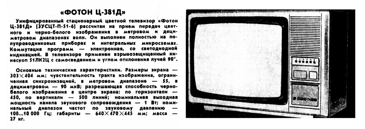 Телевизионный приёмник цветного изображения *Фотон Ц-381/Д* с 1986 года выпускал Симферопольский завод телевизоров им. 50-летия СССР. Унифицированный стационарный цветной телевизор третьего класса **Фотон Ц-381Д** (ЗУСЦТ-П-51-6) рассчитан на приём телепередач цветного и чёрно-белого изображения в МВ и ДМВ. Телевизор собран на полупроводниковых приборах и интегральных микросхемах. Коммутация программ электронная, со светодиодной индикацией ТВ канала. В модели применён взрывозащищенный кинескоп типа 51ЛК2Ц с самосведением и углом отклонения лучей в 90°. В его акустической системе установлен громкоговоритель 3ГД-38. Размеры экрана 203х404 мм. Чувствительность тракта изображения, ограниченная синхронизацией в МВ 55 мкВ, ДМВ 90 мкВ. Чёткость ч/б изображения в центре экрана; по горизонтали 450, вертикали 500 линий. Номинальная выходная мощность 1 Вт. Диапазон звуковых частот 100...10000 гц. Размеры телевизора - 640х470х445 мм. Масса 17 кг.