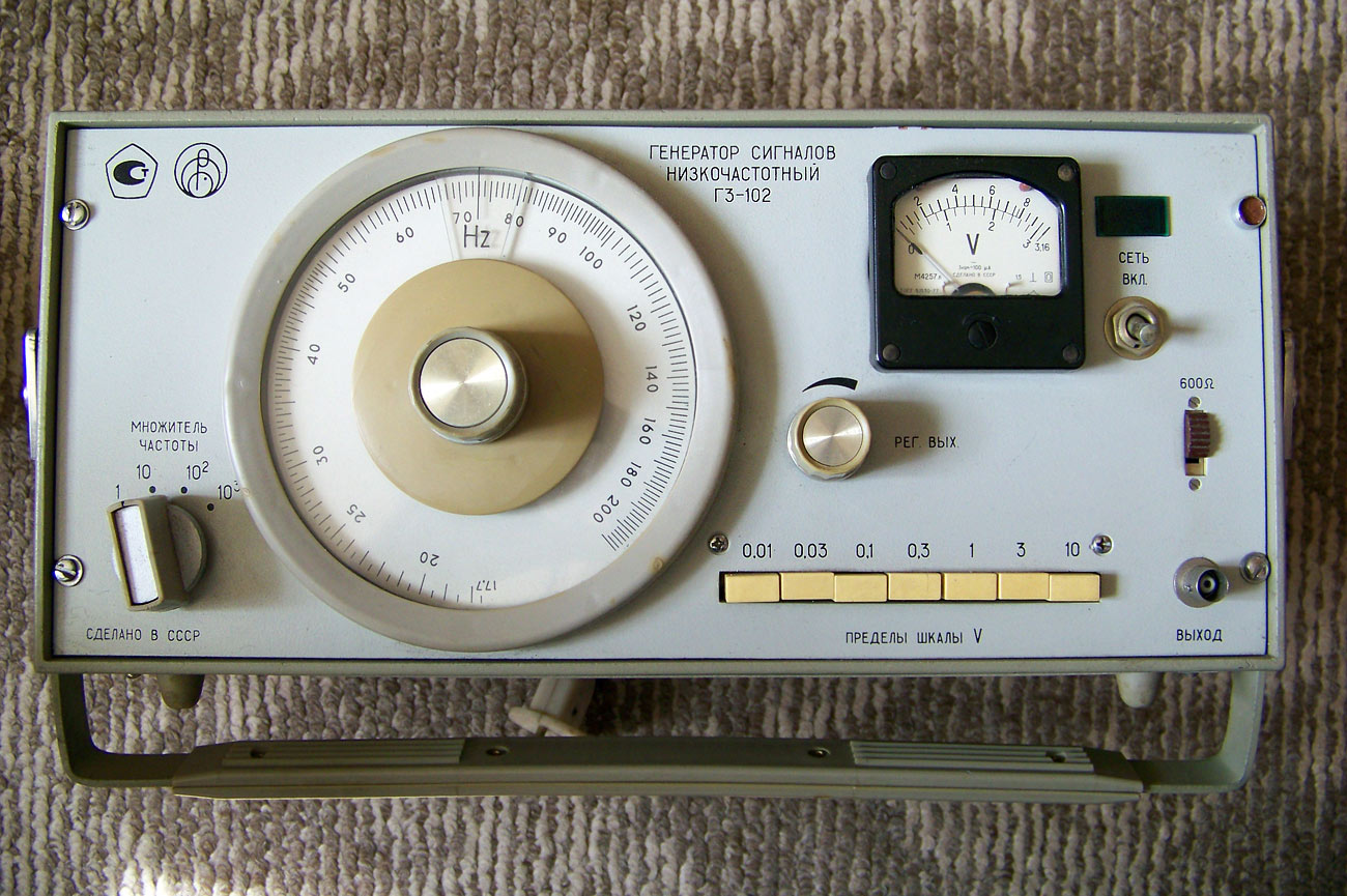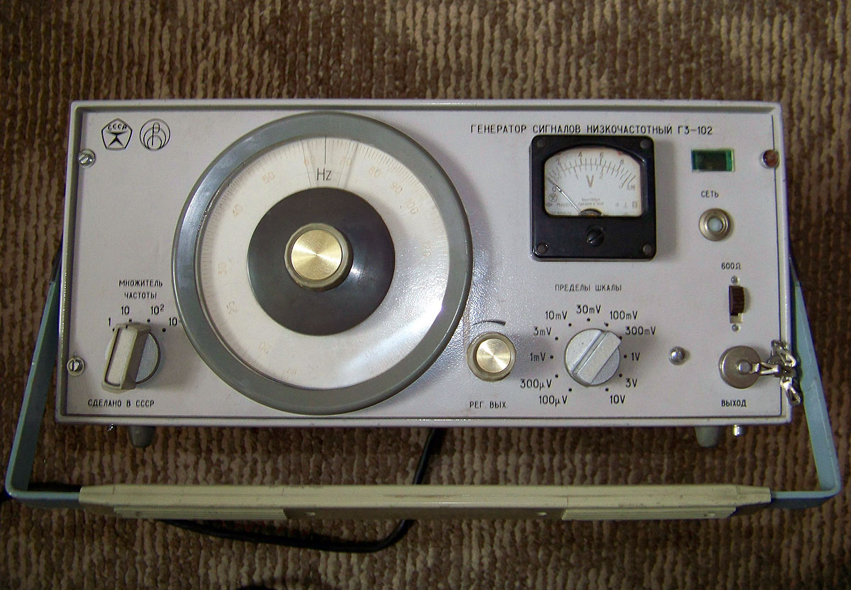 Генератор сигналов низкочастотный *Г3-102* с 1976 года выпускал Великолукский радиозавод. Генератор сигналов низкочастотный *Г3-102* предназначен для настройки усилителей звуковой частоты, аппаратуры звукозаписи и другой аппаратуры. Диапазон генерируемых частот простирается от 20 Гц до 200 кГц и реализуется переключателем на четыре положения. Максимальное напряжение выхода не менее 10 В. По внешнему оформлению генераторы более поздних выпусков (третье фото) отличались от начальных (смотрите основное и первое фото).