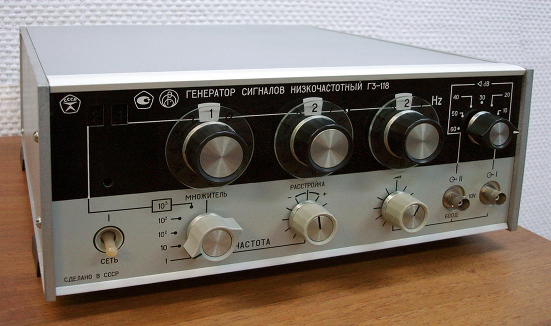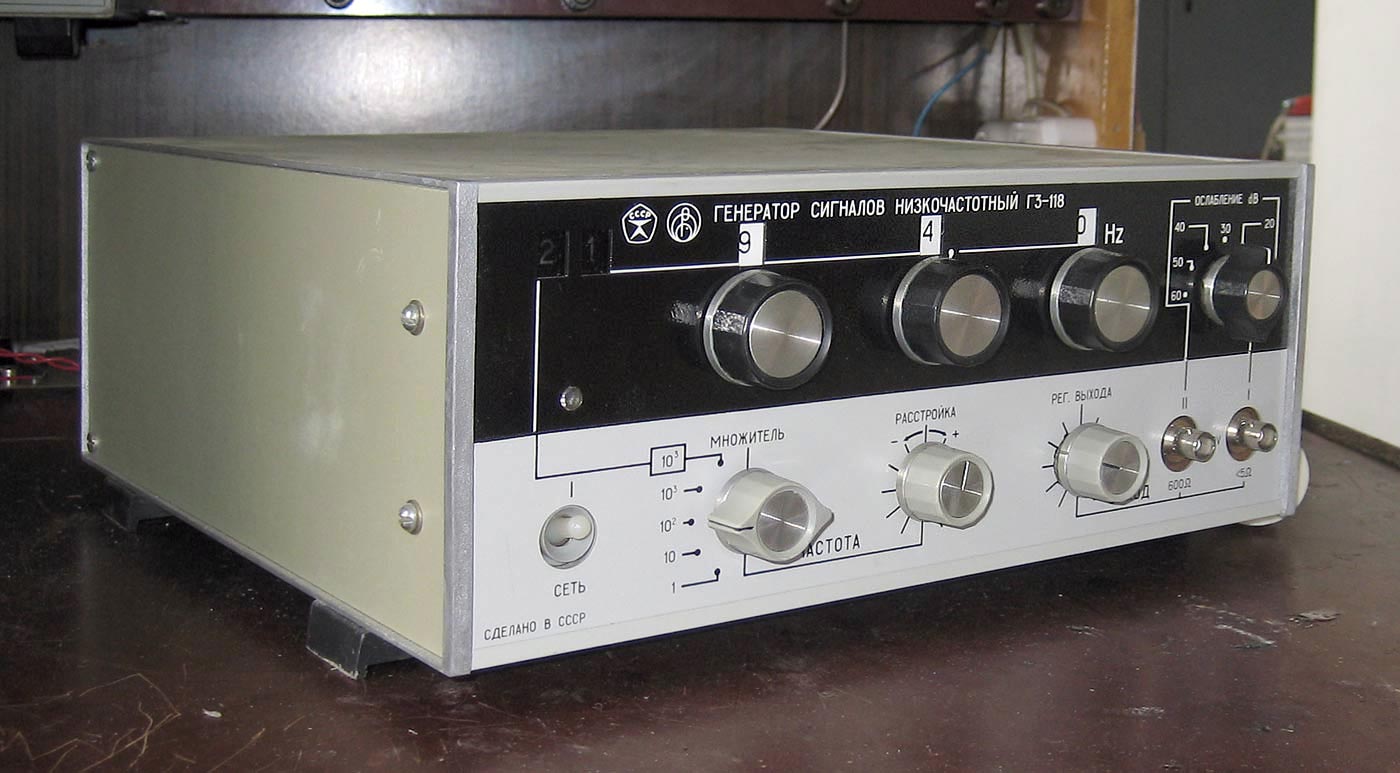 Генератор сигналов низкочастотный *Г3-118* выпускался в 80-х годах 20-го века. ГСН предназначен для настройки и контроля низкочастотной звуковой радиоаппаратуры. В генераторе имеется дискретная установка частоты в пределах каждого из пяти поддиапазонов, с возможностью плавной расстройки частоты в пределах дискретности младшего разряда, система стабилизации уровня выходного напряжения. Технические характеристики Диапазон частот: 10 Гц - 200 кГц. Установка частоты осуществляется дискретно на пяти поддиапазонах: 10...100 Гц (с шагом 0,1 Гц); 100...1000 Гц (с шагом 1 Гц); 1000...10000 Гц (с шагом 10 Гц); 10000...100000 Гц (с шагом 100 Гц); 100000...200000 Гц (с шагом 100 Гц).