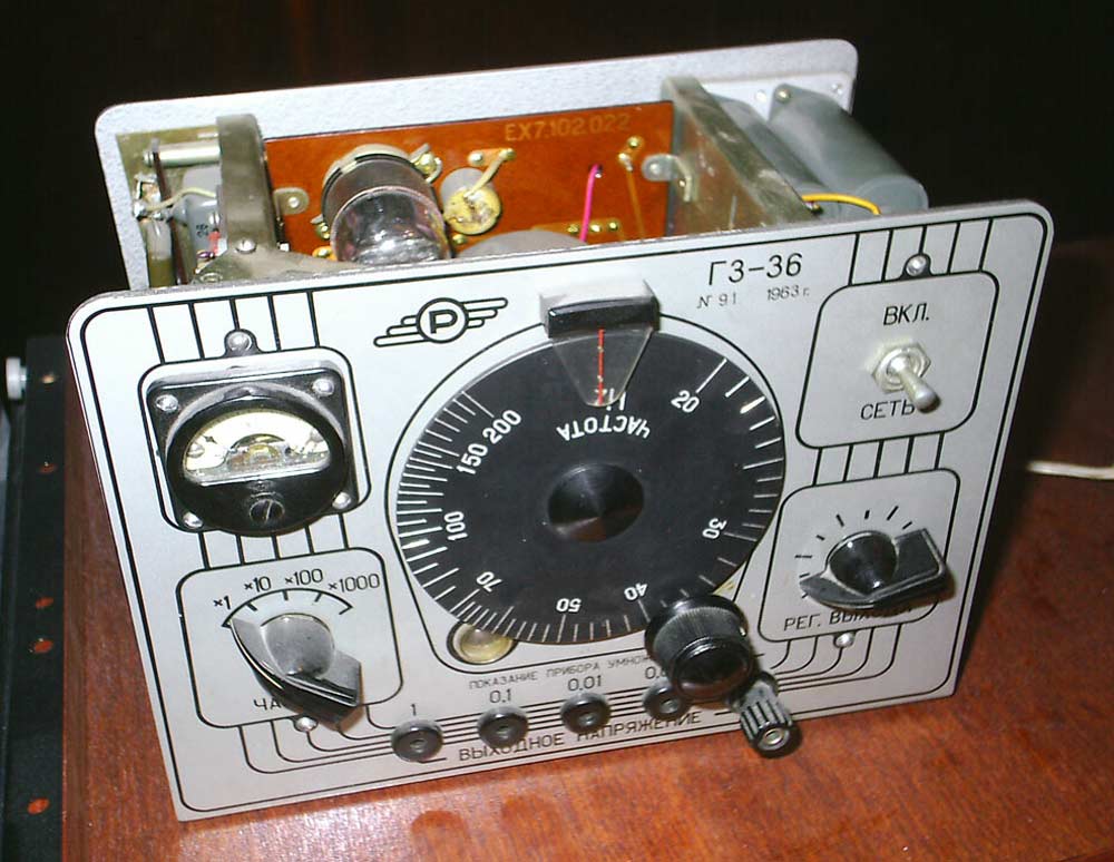 Генератор сигналов низкочастотный *Г3-36* выпускался с 1963 года Великолукским радиозаводом. Генератор *Г3-36* представляет собой портативный источник синусоидальных электрических колебаний звуковых и ультразвуковых частот. Генератор предназначен для, настройки, регулировки и испытания НЧ каскадов радиоаппаратуры в лабораторных и производственных условиях. Имеется регулировка выходного напряжения, контролируемая индикатором. Диапазон частот 20...200000 Гц. Выходное напряжение на нагрузке 600 Ом до 5 В. Коэффициент гармоник 2%. Питание от сети. Потребляемая мощность 7 Вт. Габариты прибора 260х230х165 мм. Масса 5 кг. В 1967 году генератор претерпел 1-ю модернизацию, а в конце 70-х вторую, после чего генератор стал именоваться как *Г3-36А*.