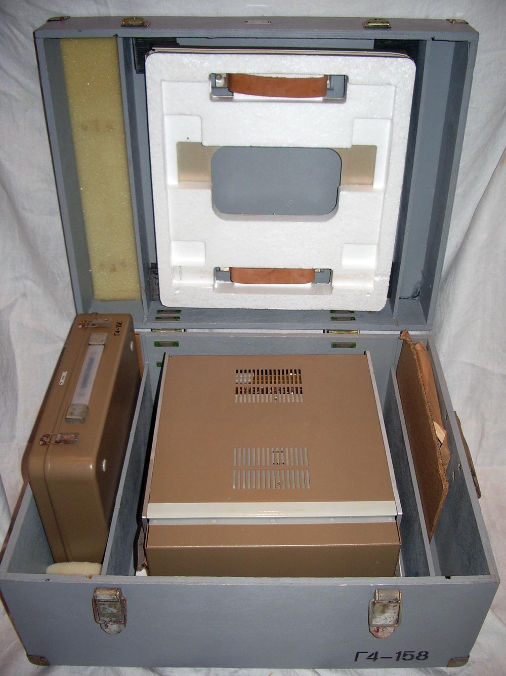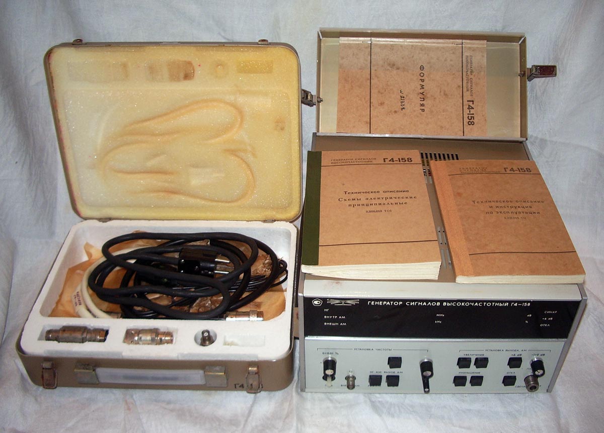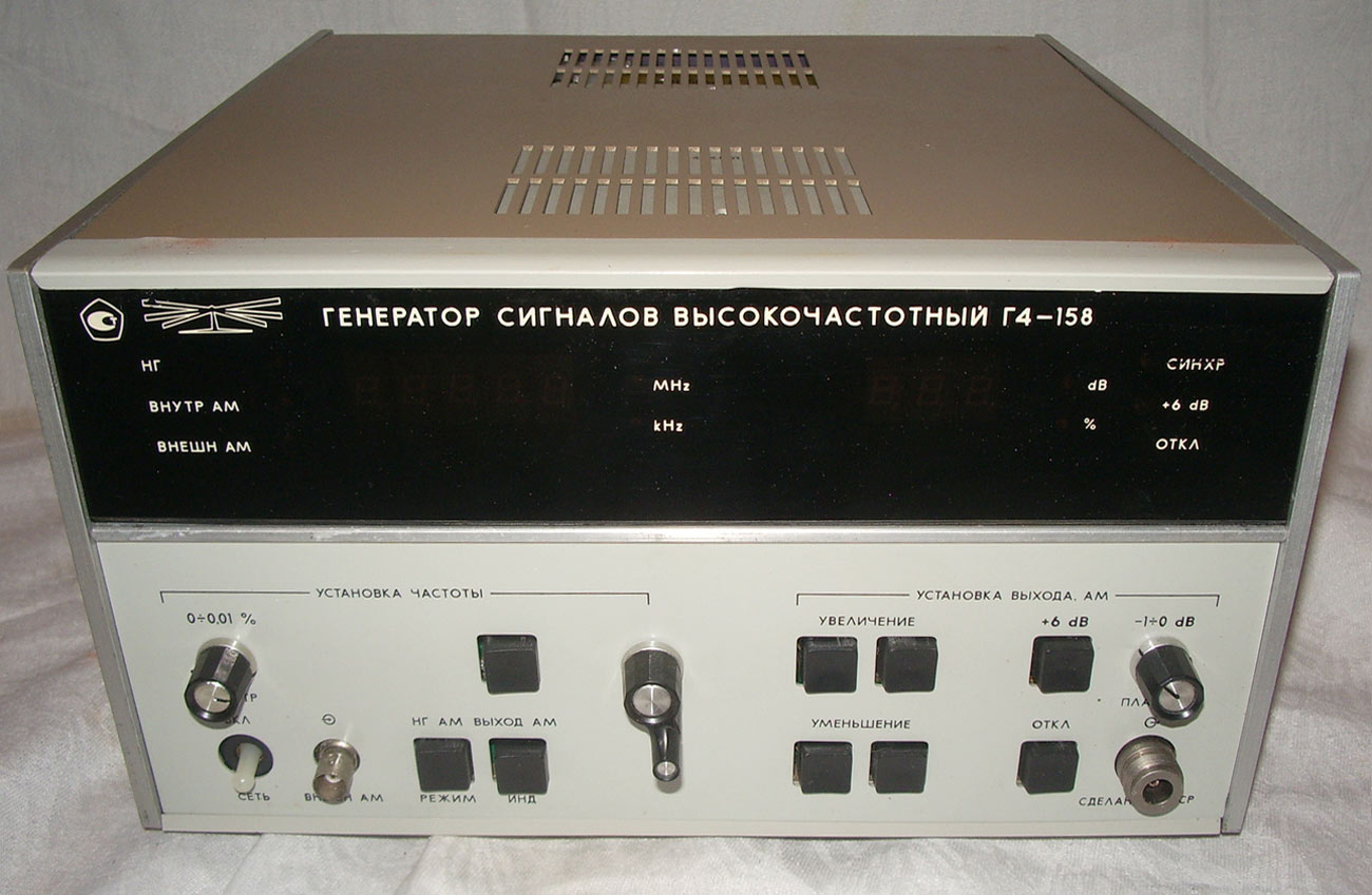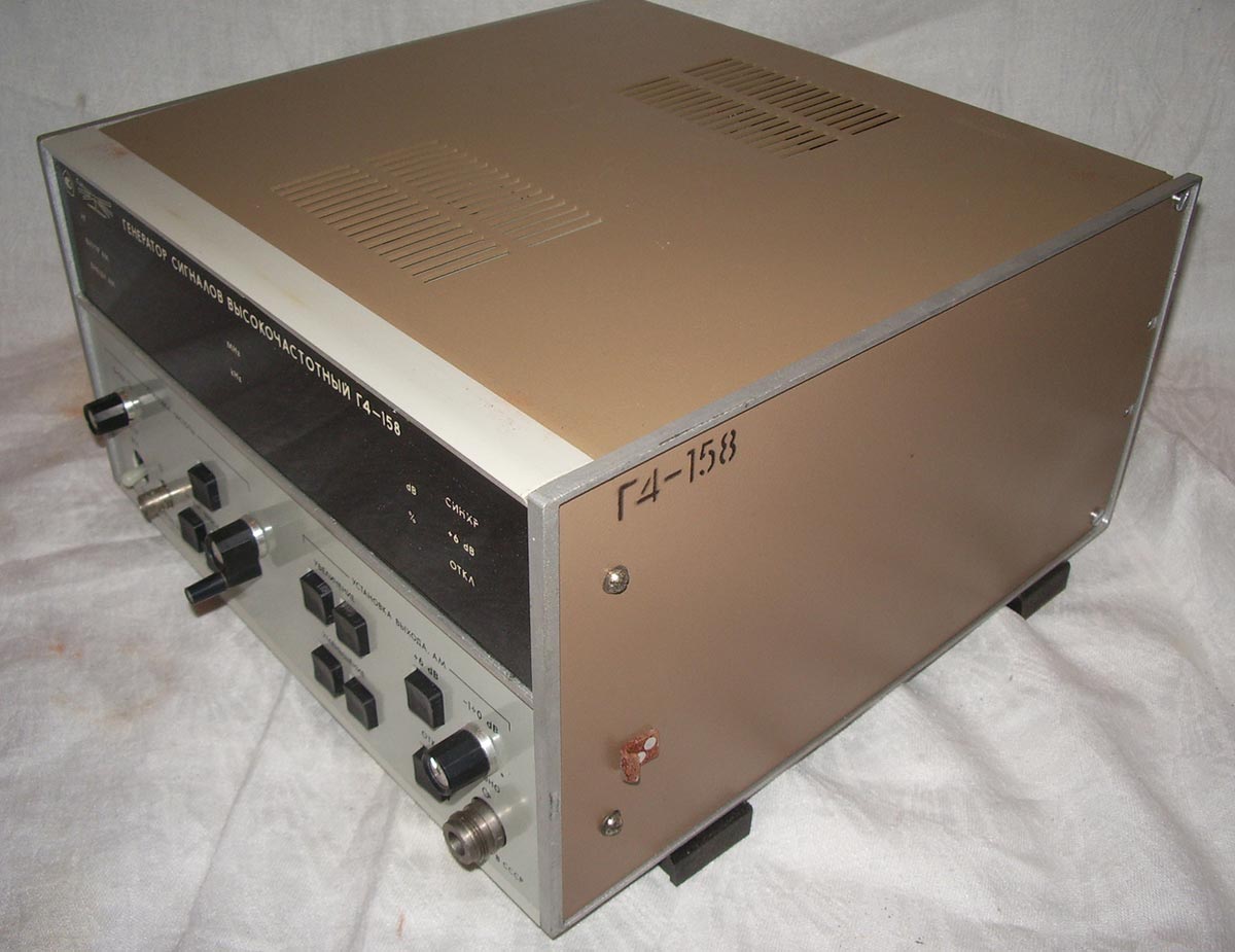 Генератор высокочастотный *Г4-158* с 1988 года выпускал Нижегородский завод им. М.В.Фрунзе. Диапазон частот 10 КГц...100 МГц разбит на 4 поддиапазона: 10...100 КГц, 100 КГц...1 МГц, 1...10 МГц, 10...100 МГц. Прибор имеет дистанционное управление. Габариты генератора 340х175х415 мм. Масса 10,5 кг.