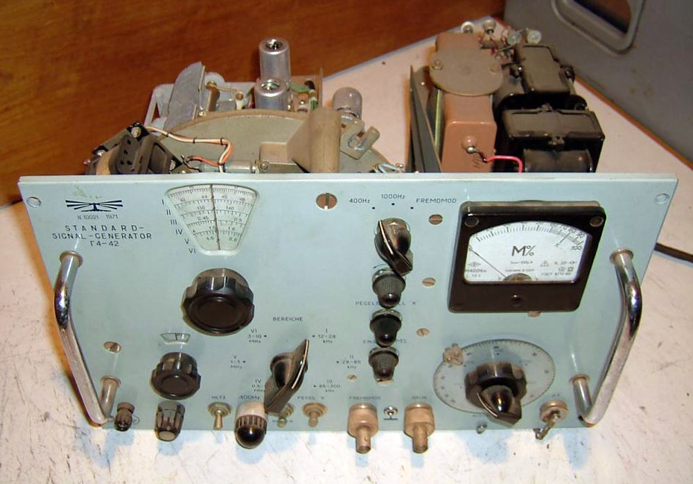 Генератор высокочастотных сигналов *Г4-42* выпускался с 1970 года. Генератор высокочастотных сигналов *Г4-42* предназначен для проверки и настройки электронной аппаратуры. Диапазон частот - 120 КГц...10 МГц. Выходное калиброванное напряжение регулируемое от 0,1 мкВ до 110 мВ. Напряжение питания 220 В, 50Гц; 115В, 400Гц. Потребляемая мощность 100 Вт. Габаритные размеры генератора 388х289х285 мм. Масса 18 кг.