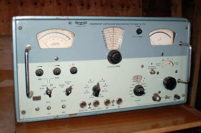 Генератор стандартных сигналов *Г4-70* выпускался с 1973 года ГСС предназначен для контроля и настройки различных радиоприёмных устройств, работающих в АМ и ЧМ. ГСС излучает спектр частот от 1 до 300 МГц, разбитый на 8 поддиапазонов: 1: 4,0 - 6,2, 2: 6,2 - 9,7, 3: 9,7 - 16,0, 4: 16,0 - 27,0, 5: 27,0 - 48,0, 6: 48,0 - 89,0, 7: 89,0 - 170,0, 8: 170,0 - 300,0 МГц. Выходное калиброванное напряжение может изменяться от 5 мкВ до 50 мВ. Есть возможность промодулировать несущую внутренним генератором или внешним сигналом. Подробнее в инструкции.