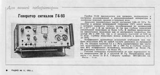 Генератор сигналов *Г4-93* выпускался с начала 1972 года. Предназначен для контроля, проверки и настройки различной приёмо-передающей аппаратуры работающей в диапазоне от 30 КГц до 40 МГц (реально от 100 КГц д 50 МГц. Подробнее в рекламном описании журнала Радио.