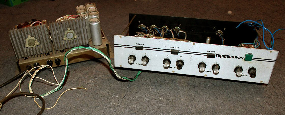 Транзисторный усилитель *Гармония-25* с акустической системой с 1984 года выпускали в Уфе, на А/я 37. Высококачественный усилитель НЧ с АС *Гармония-25* с высоким акустическим КПД предназначен для усиления электрических сигналов с ЭМИ и их воспроизведение высококачественным акустическим агрегатом. Технические параметры установки. Номинальная выходная мощность усилителя 12 Вт, максимальная 25 Вт. Коэффициент нелинейных искажений не более 1%. Диапазон рабочих частот усилителя 30...2000 Гц, акустической системы по звуковому давлению 80...14000 Гц. Среднее звуковое давление 0,4 Па. В усилителе имеются плавные регуляторы тембра по НЧ и ВЧ частотам. Питается усилитель от сети 220 В. Потребляемая максимальная мощность 100 ВА. Габариты усилителя с АС 1100х500х250 мм. Его масса 35 кг. Цена 525 рублей.