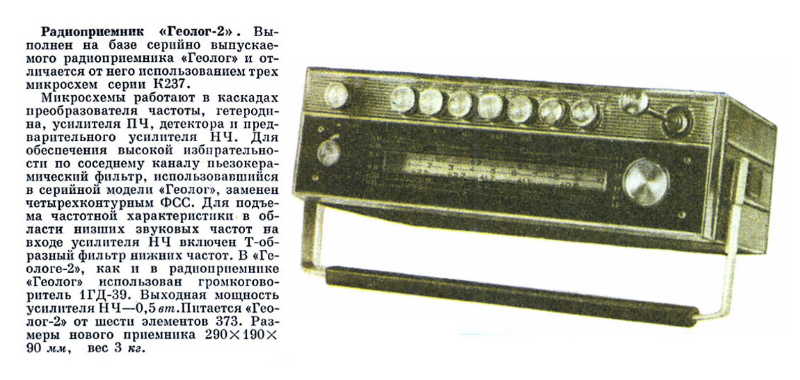 Портативный транзисторный радиоприемник *Геолог-2* с 1972 года выпускал Днепропетровский радиозавод. Радиоприёмник выполнен на базе радиоприёмника *Геолог*, отличаясь использованием трёх микросхем серии *К237*. Они работают в преобразователе частоты, гетеродине, УПЧ, детекторе и предварительном усилителе НЧ. Для обеспечения высокой избирательности по соседнему каналу пьезокерамический фильтр, использовавшийся в модели *Геолог*, заменен четырехконтурным ФСС. Для подъема АЧХ в области низших звуковых частот на входе УНЧ включен Т-образный фильтр нижних частот. Как и в приёмнике *Геолог*, здесь установлен громкоговоритель 1ГД-39. Номинальная выходная мощность 0.5 Вт. Питается приёмник от 6 элементов 373. Размеры модели 290х190х90 мм, его масса 3 кг.