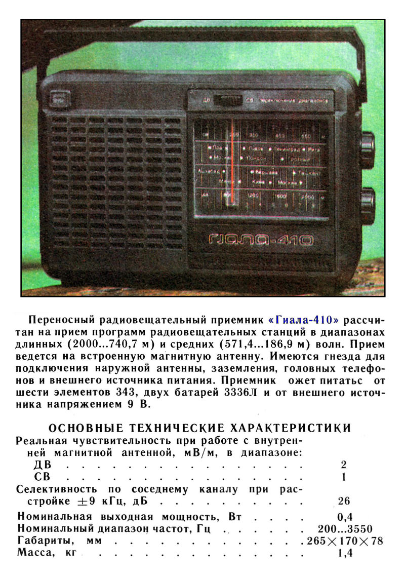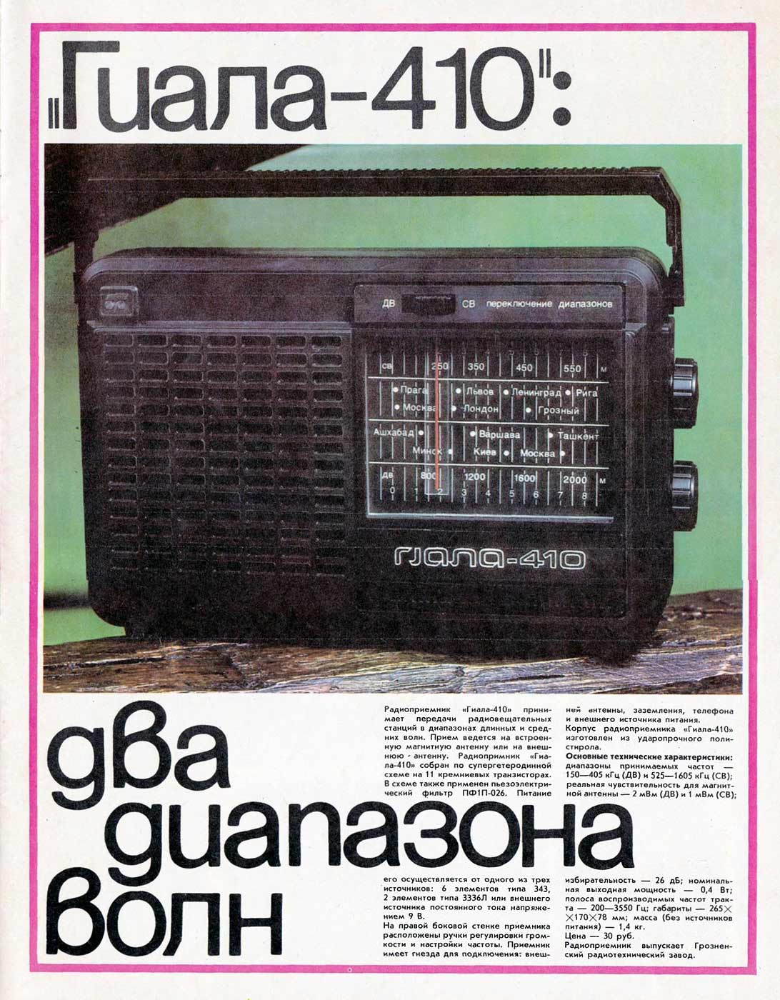Портативный радиоприёмник *Гиала-410* предположительно с 1980 года выпускал *Грозненский радиотехнический завод*. Приёмник рассчитан на приём радиостанций в диапазонах ДВ (2000...740,7 м) и (СВ 571,4...186,9 м) волн. Приём ведется на встроенную магнитную антенну. В нём имеются гнёзда для подключения наружной антенны, заземления, телефонов, внешнего питания. Питание от 6-ти элементов 343, 2-х батарей 3336Л или внешнего источника. Чувствительность с магнитной антенной в диапазонах: ДВ 2, СВ 1 мВ/м. Селективность 26 дБ. Номинальная выходная мощность 0,4, максимальная 0,7 Вт. Номинальный диапазон воспроизводимых частот 200...3550 Гц. Габариты приёмника 265х170х78 мм. Его масса - 1,4 кг. Цена - 30 рублей. В 1986 года радиоприёмник был переведён в 3-й класс и выпускался под наименованием *Гиала-310*.