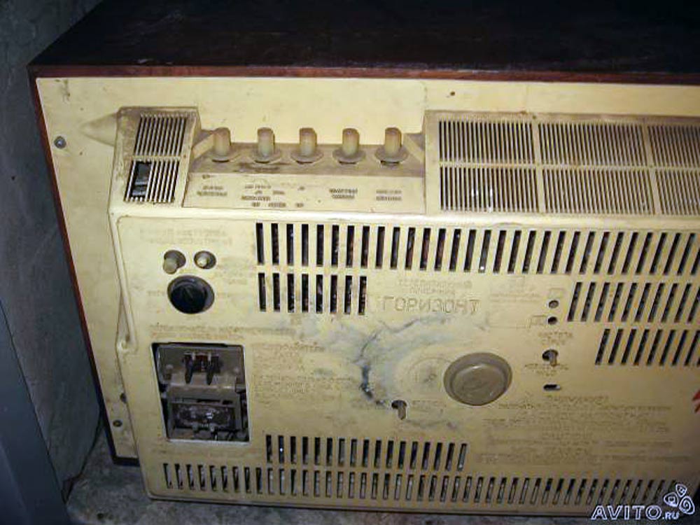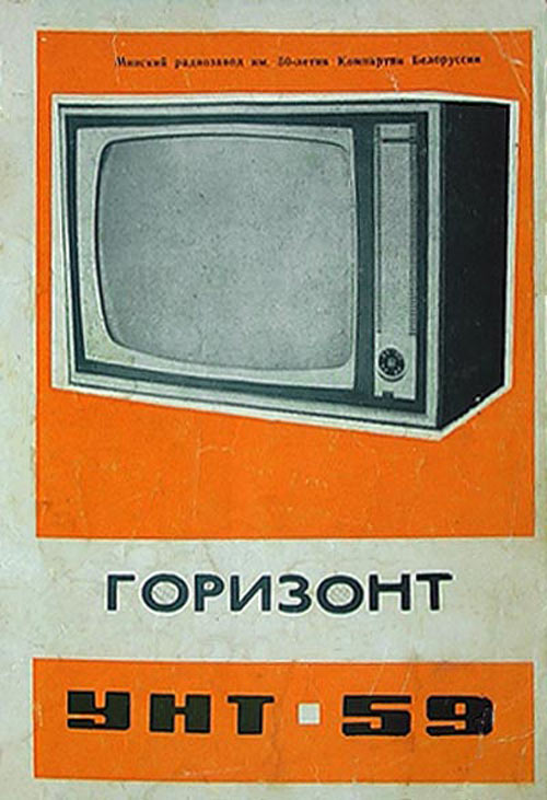 Телевизор ч/б изображения *Горизонт* с 1968 года выпускал Минский радиозавод имени 50-летия КПБ и Минский радиозавод имени В. И. Ленина. Ламповый унифицированный телевизор второго класса **Горизонт** (УНТ-59-II-1) предназначен для приёма програм на любом из 12 стандартных телевизионных каналов. Телевизор имеет 17 радиоламп, 22 диода и кинескоп типа 59ЛК2Б с размером экрана 385 х 489 мм. Модель выпускали в настольном и настольно-напольном вариантах (с ножками в комплекте), с различной отделкой футляра и передней панели. Аппарат отвечает всем техническим характеристикам для унифицированных телевизоров этого типа. Чувствительность по каналу изображения со входа антенны 50 мкВ. Номинальная выходная мощность 1,5 Вт. Частотная характеристика по звуковому воспроизведению - 100...10000 Гц. Габариты телевизора 525 х 700 х 430 мм, масса 36 кг. Потребляемая от электрической сети 110, 127 или 220 В мощность не превышает 180 Вт.