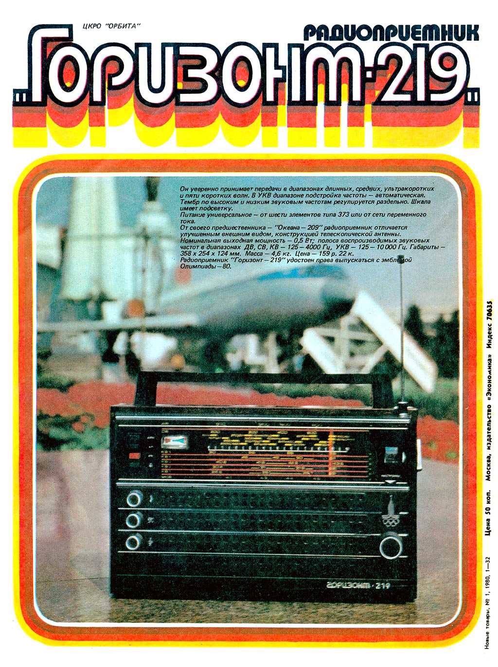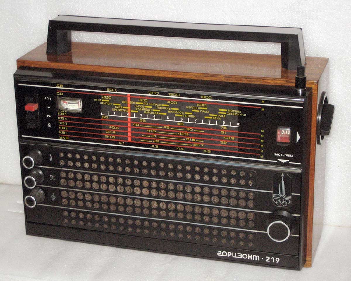 Переносной радиоприёмник *Горизонт-219* (Олимпийский) с 1979 года выпускало Минское ПО *Горизонт*. Приёмник создан на основе модели *Океан-209*. Он рассчитан на работу в ДВ, СВ, УКВ, а также в 5-ти растянутых KB поддиапазонах и имеет раздельную регулировку тембра по ВЧ и НЧ, индикатор настройки, АПЧГ в УКВ диапазоне. Питание от 6-ти элементов 373 или от сети переменного тока через встроенный БП. Имеется выход сигнала на магнитофон или внешний УНЧ. Приёмник имеет подсветку шкалы и телескопическую антенну с фиксацией под углом 45 и 90 градусов. Чувствительность с магнитной антенной в диапазоне ДВ - 1 мВ/м, СВ - 0,7 мВ/м, с телескопической антенной в поддиапазонах KB-I...IV 150, KB-V 250 мкВ, диапазоне УКВ 35 мкВ. Полоса воспроизводимых частот в тракте АМ 125...4000, ЧМ 125..10000 Гц. Номинальная выходная мощность 0,5, максимальная 1,5 Вт. Габариты РП 358х254х124 мм. Вес 4,6 кг.