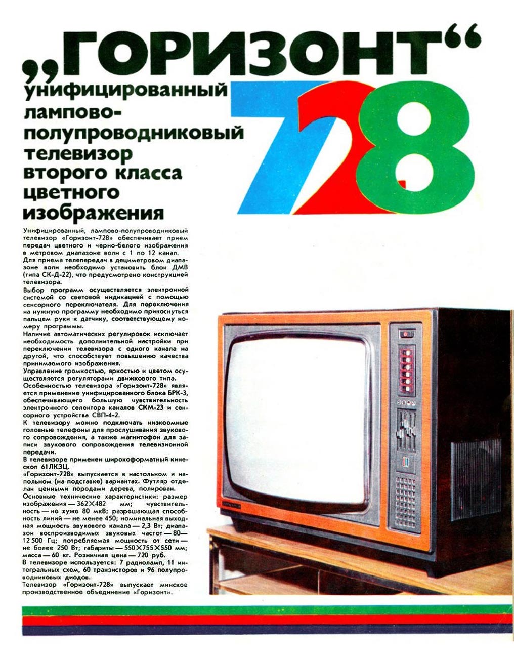 Телевизор цветного изображения *Горизонт-728/Д* с 1978 года выпускало Минское производственное объединение *Горизонт*. **Горизонт-728/Д** унифицированный цветной телевизор 2-го класса с диагональю кинескопа 61 см. Аппарат имеет лампово-полупроводниковую схему, созданную на основе модели **Горизонт-723** выпускаемой с 1977 года. Первые телевизоры **Горизонт-728/Д** комплектовались деревянной подставкой с высокими ножками, а позднее просто ножками для установки на стол или тумбочку. Телевизоры работают в диапазоне МВ, а с индексом *Д* в МВ и ДМВ диапазонах. Подробнее о параметрах телевизора *Горизонт-728/Д* читайте в рекламном проспекте и его инструкции по эксплуатации.
