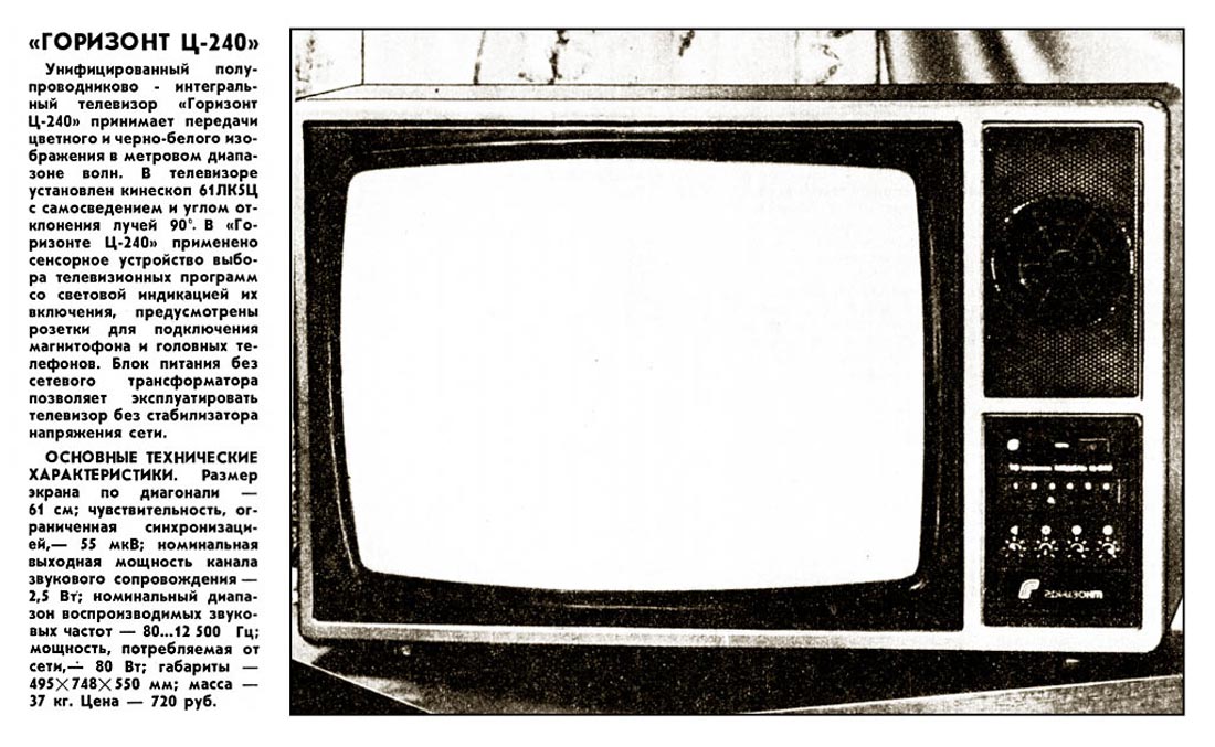 Цветной телевизор *Горизонт Ц-240* подготовило к выпуску в 1987 году Минское ПО *Горизонт*. Цветной унифицированный полупроводниковый телевизор 2-го класса **Горизонт Ц-240** принимает передачи цветного или ч/б изображения в МВ диапазоне. В телевизоре установлен кинескоп 61ЛК5Ц с самосведением и углом отклонения лучей 90 градусов. В модели применено сенсорное устройство для выбора программ со световой индикацией. Есть гнёзда для подключения магнитофона и головных телефонов. Импульсный БП позволяет включать аппарат без стабилизатора напряжения. Основные технические характеристики: Чувствительность 55 мкВ. Номинальная выходная мощность канала звука 1,5 Вт. Диапазон воспроизводимых частот 80...12500 Гц. Мощность потребляемая от сети 80 Вт. Габариты телевизора 495х748х550 мм. Вес 37 кг. Цена 720 руб.