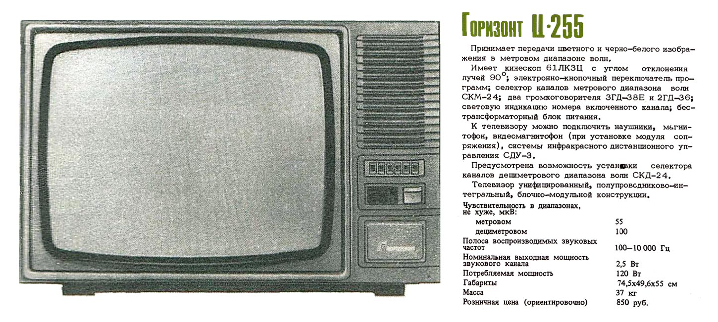 Цветной телевизор *Горизонт Ц-255* с I-кв 1983 года выпускало Минское ПО *Горизонт*. В унифицированном полупроводниково-интегральном телевизоре **Горизонт-Ц-255** применены самые современные достижения электронной техники (на 1982 год). Телевизор принимает передачи в метровом диапазоне волн. Модель имеет электронно-кнопочный переключатель программ со световой индикацией номера рабочего канала. Применение интегральных схем и полупроводников, бестрансформаторного блока питания позволило значительно уменьшить вес аппарата и потребление электроэнергии. К телевизору можно подключить наушники, магнитофон, а с помощью модуля сопряжения и видеомагнитофон. Предусмотрена возможность установки системы инфракрасного ДУ, селектора каналов ДМВ. Диагональ экрана 61 см. Потребляемая мощность 120 Вт. Чувствительность телевизора в МВ диапазоне 55 мкВ, в ДМВ 100 мкВ (при установке селектора). Полоса воспроизводимых частот звука 100...10000 Гц. Номинальная выходная мощность канала звука 2,5 Вт. Габариты телевизора 745х496х550 мм. Масса аппарата без упаковки 37 кг.