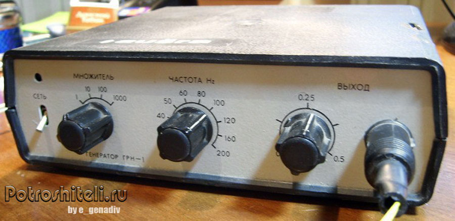 Генератор низкочастотный *ГРН-1* с 1985 года выпускал Вильнюсский завод РИП. Генератор применяется в радиолюбительской практике при настройке низкочастотных устройств. Диапазон генерируемых частот 20 Гц - 200 кГц. Точность установки частоты - 3%. Коээфициент гармоник 3%. Неравномерность АЧХ в полосе частот - 0,8 дБ. Максимальное выходное напряжение при нагрузке 600 Ом - 0,5 В. Питание сеть ~ 220 В.