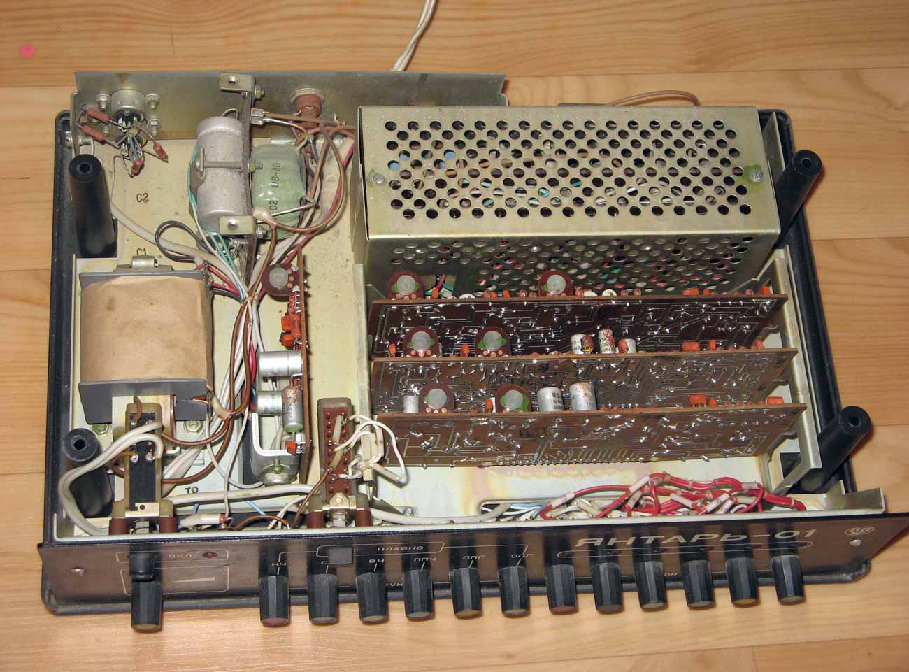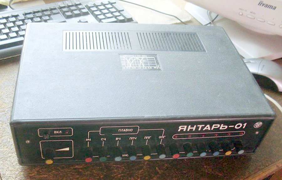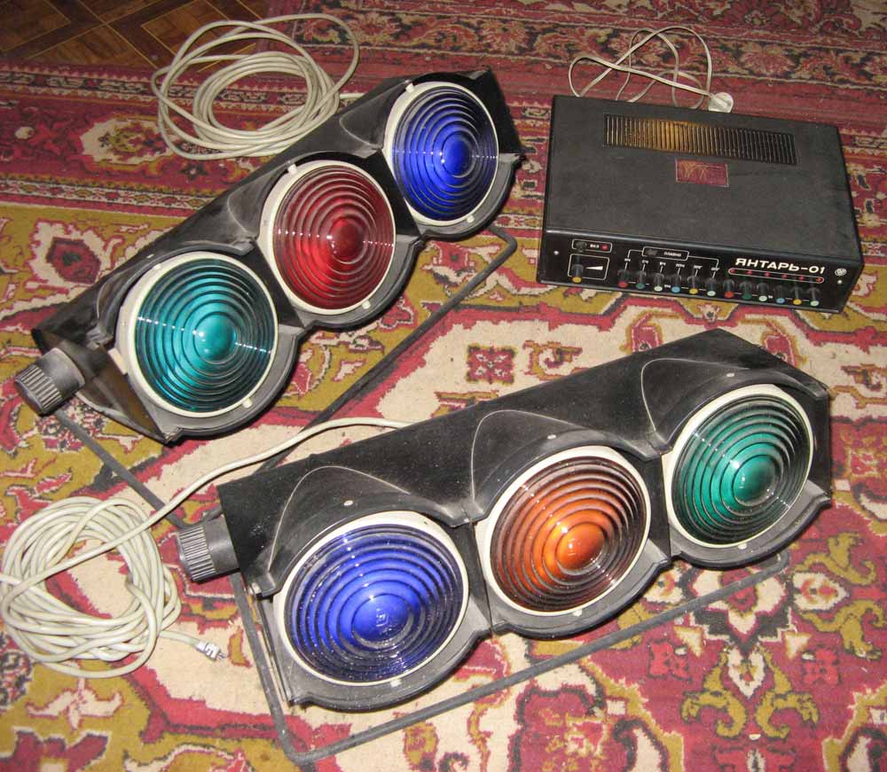Устройство светодинамическое *Янтарь-01* выпускалось с I-кв 1986 года. УСД предназначено для цветового сопровождения муыкальных произведений при совместной работе с моно или стереофонической аппаратурой, имеющей линейный выход, а может использовано и как цветной светильник с плавной регулировкой яркости ламп для каждого канала отдельно. Устройство не только усиливает эмоциональное воздействие музыкальных произведенй, но и создает особую атмосферу в помещении. В устройстве, по сравнению с выпускающимися подобного типа устройствами, имеются отличительные особенности: 3 режима работ (статический, динамический, смешанный), возможность уменьшения скорости изменения цветового рисунка в динамическом и смешанном режимах работе, большее количество световых каналов, индикация работы каждого канала на блоке управления, использование эффективных способов преобразования звука в свет.