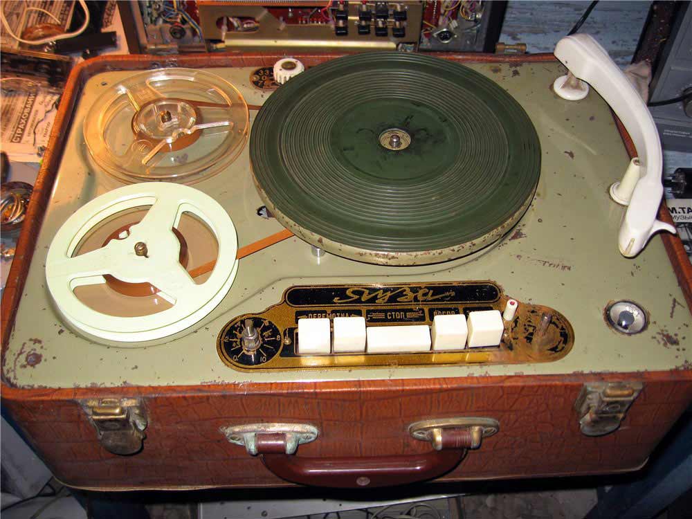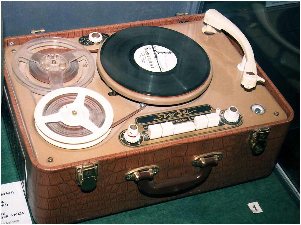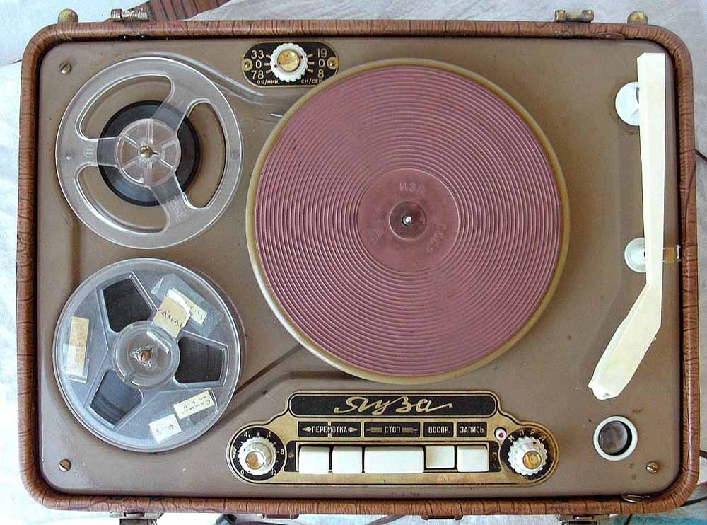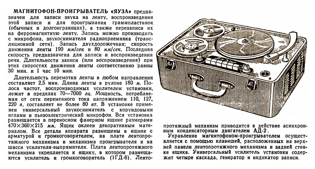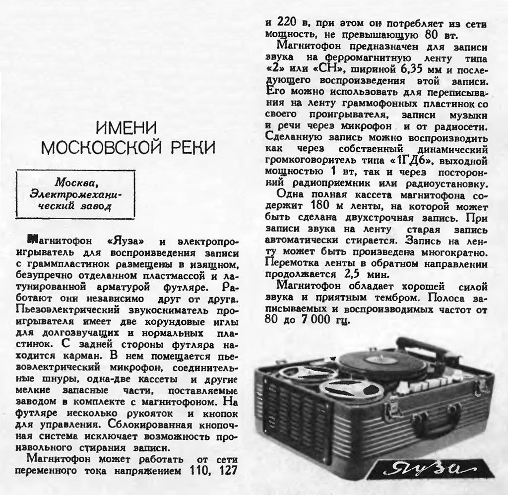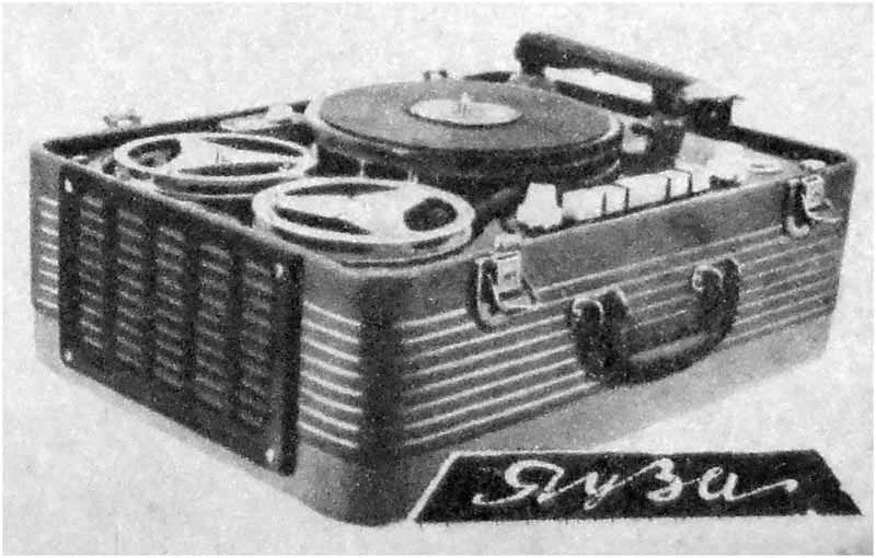 Магнитофон-граммофон *Яуза* (первенец завода) с 1956 года выпускал Московский ЭМЗ №1. Аппарат состоит из магнитофона и проигрывателя пластинок. Магнитофон рассчитан на запись и воспроизведение 2-х дорожечных фонограмм. ЛПМ имеет 2 скорости: 19,5 см/сек и нестандартную 8,13 см/сек, для записи речи. Время записи на 2-х дорожках на 1-й скорости 30 мин, на 2-й 1 час.10 мин. Катушки вмещают 180 метров магнитной ленты типа 1. Есть ускоренная перемотка ленты (2,5 мин.) в прямом и обратном направлениях. ЛПМ приводится в действие двигателем АД-2 и управляется клавишным переключателем. На выходе включены два громкоговорителя 1ГД-9. Полоса частот на 1-й скорости 70....7000 Гц, на 2-й 100...4000 Гц. Есть разъём для дополнительного громкоговорителя и вход адаптера. ЭП двухскоростной, с пьезокерамическим звукоснимателем с 2-мя долговечными корундовыми иглами для обычных и долгоиграющих пластинок. Питание от сети 110, 127 и 220 В. Потребляемая мощность ~ 80 Вт. Установка размещена в переносном футляре размерами 470х360х215 мм, оклеенном дермантином. В комплекте пьезоэлектрический микрофон. Масса модели 18 кг. На 1-м рисунке нулевой вариант аппарата, который в серию не пошёл. В серию пошёл 1-й вариант, он на всех фото. Был и 2-й вариант, отличавшийся громкоговорителями, изменениями в схеме, монтаже, ЛПМ и ЭПУ. Внешний вид был как у 1-го варианта. Радио №8/1963 ст.48