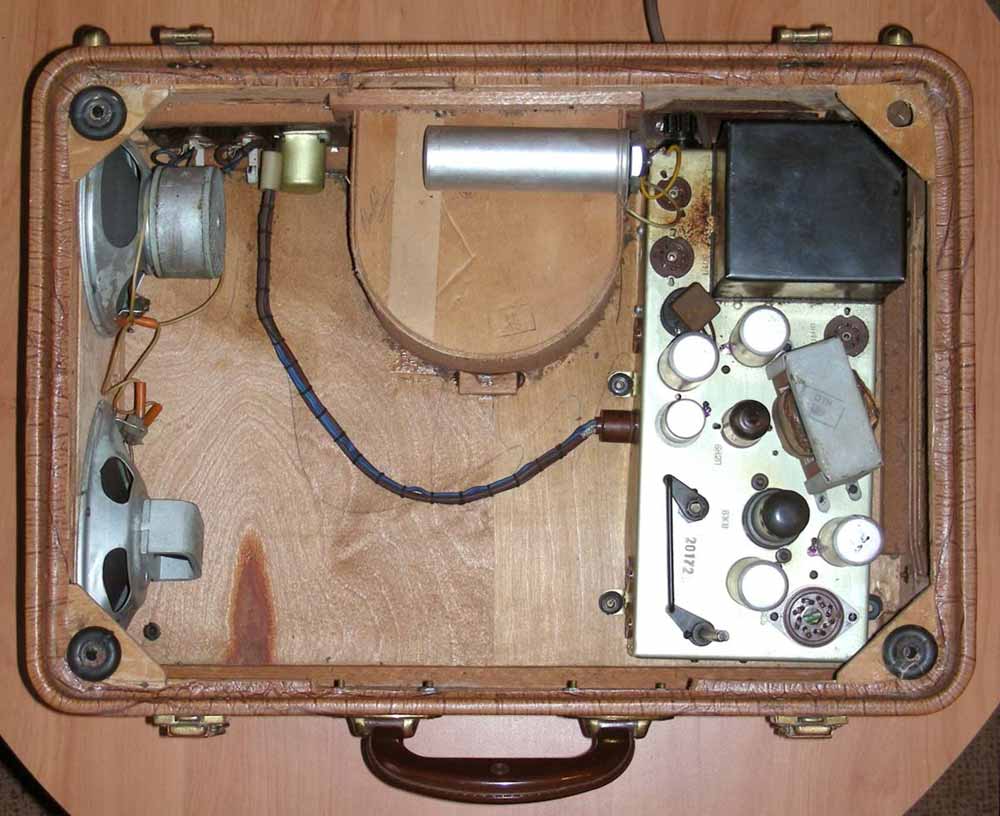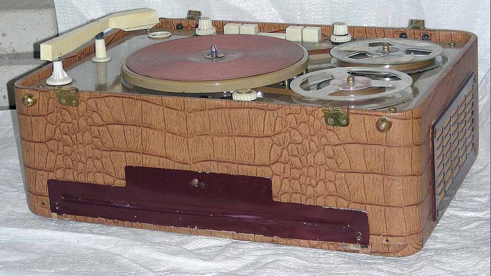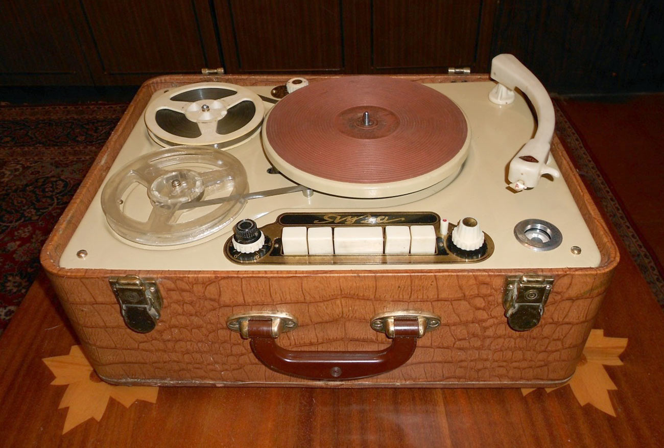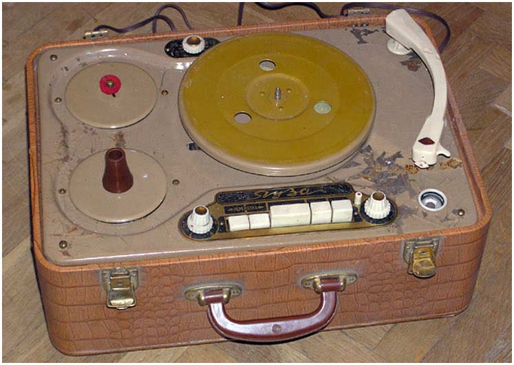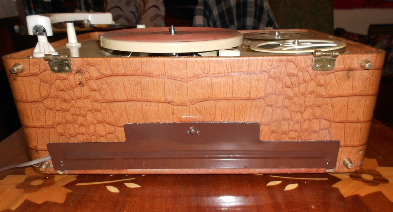 Магнитофон-граммофон *Яуза* (первенец завода) с 1956 года выпускал Московский ЭМЗ №1. Аппарат состоит из магнитофона и проигрывателя пластинок. Магнитофон рассчитан на запись и воспроизведение 2-х дорожечных фонограмм. ЛПМ имеет 2 скорости: 19,5 см/сек и нестандартную 8,13 см/сек, для записи речи. Время записи на 2-х дорожках на 1-й скорости 30 мин, на 2-й 1 час.10 мин. Катушки вмещают 180 метров магнитной ленты типа 1. Есть ускоренная перемотка ленты (2,5 мин.) в прямом и обратном направлениях. ЛПМ приводится в действие двигателем АД-2 и управляется клавишным переключателем. На выходе включены два громкоговорителя 1ГД-9. Полоса частот на 1-й скорости 70....7000 Гц, на 2-й 100...4000 Гц. Есть разъём для дополнительного громкоговорителя и вход адаптера. ЭП двухскоростной, с пьезокерамическим звукоснимателем с 2-мя долговечными корундовыми иглами для обычных и долгоиграющих пластинок. Питание от сети 110, 127 и 220 В. Потребляемая мощность ~ 80 Вт. Установка размещена в переносном футляре размерами 470х360х215 мм, оклеенном дермантином. В комплекте пьезоэлектрический микрофон. Масса модели 18 кг. На 1-м рисунке нулевой вариант аппарата, который в серию не пошёл. В серию пошёл 1-й вариант, он на всех фото. Был и 2-й вариант, отличавшийся громкоговорителями, изменениями в схеме, монтаже, ЛПМ и ЭПУ. Внешний вид был как у 1-го варианта. Радио №8/1963 ст.48