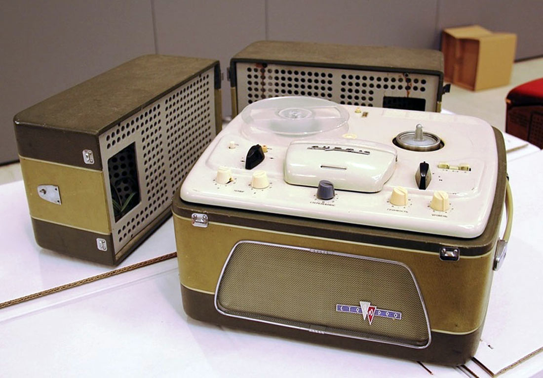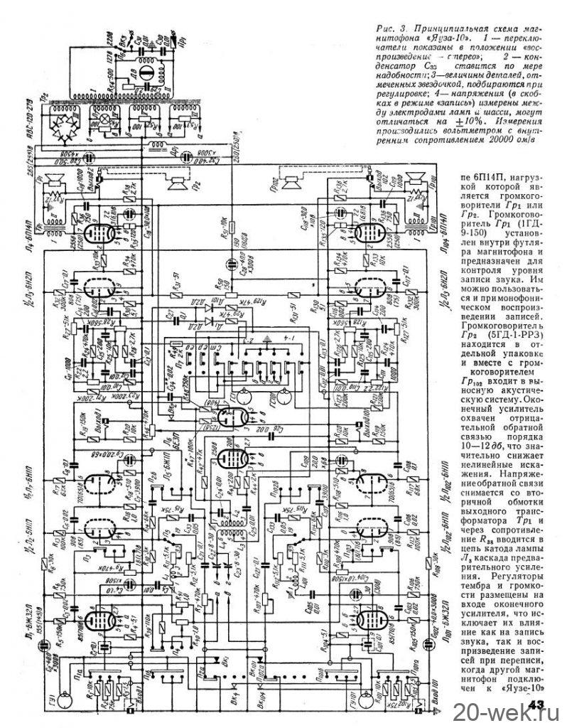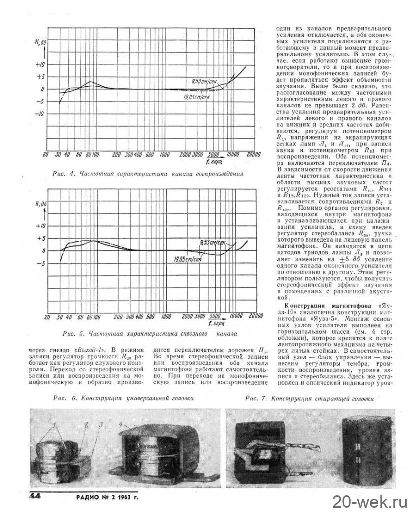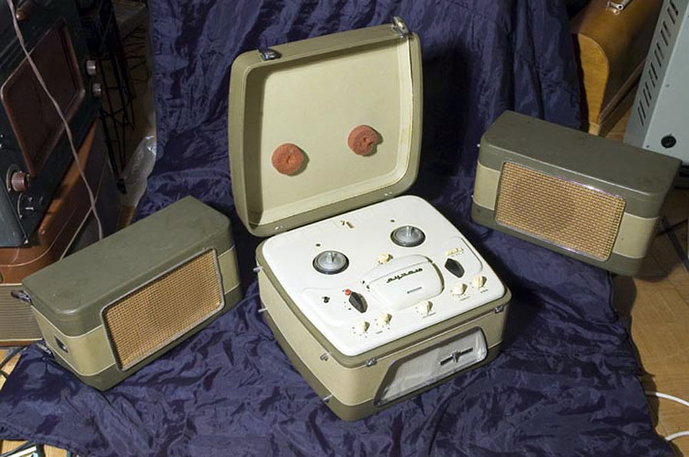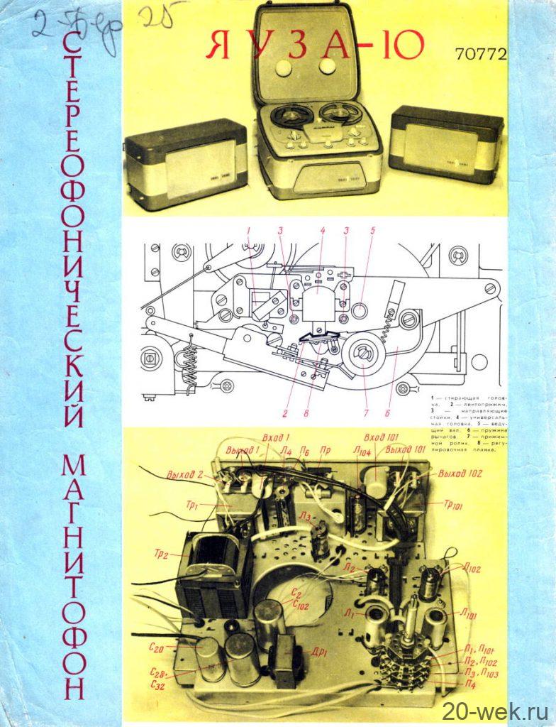 Стереофонический магнитофон *Яуза-10* с начала 1961 года выпускал Московский электромеханический завод № 1. **Яуза-10** - это первый отечественный стереофонический четырёхдорожечный магнитофон. Он имеет две скорости движения магнитной ленты; 19,05 и 9,53 см/сек. При стереофонической записи он работает как двухдорожечный, при монофонической, как четырехдорожечный. В модели применена двухканальная стереофоническая система записи и воспроизведения звука, для чего используются две малогабаритные акустические системы которые состоят из широкополосных громкоговорителей. Кроме того в магнитофоне имеется контрольный громкоговоритель. Лентопротяжный механизм магнитофона рассчитан на применение катушек № 15 вмещающих 250 метров ферромагнитной ленты. Время звучания катушки при стереозаписи 2х22 минуты на скорости 19 и 2х45 минут на скорости 9. При монофонической записи время увеличивается до 4х22 и 4х45 мин. Акустические параметры магнитофона зависят от скорости и типа ленты. При использовании ленты типа 6 на работу с которой рассчитан магнитофон, полоса рабочих частот 40...15000 Гц на большей скорости и 60...10000 Гц на меньшей. При выходной мощности 3 Вт КНИ сквозного канала 5%. Детонация на скорости 19,05 см/сек - 0,4%, на 9,53 см/сек - 0,6%. Динамический диапазон сквозного канала 40 дБ. Переходной уровень между дорожками по сквозному каналу при стереофонической записи 30 дБ, монофонической 40 дБ. Регуляторы тембра НЧ, ВЧ обеспечивают завал АЧХ на 10 дБ а тембра НЧ еще и подъём на 10 дБ. При использовании магнитной ленты типа 2 сужается диапазон рабочих звуковых частот и увеличивается рассогласование АЧХ между каналами, уменьшаются динамический диапазон и переходные уровни. Чувствительность с микрофона 3 мВ, со звукоснимателя 200 мВ, радиолинии 2 В. Потребляемая мощность при записи 110 Вт. Размеры магнитофона 395х370х210 мм. Выносных АС 365х300х200 мм. Масса аппарата 14,5 кг, выносных АС 4,5 кг вместе. Цена магнитофона 400 рублей. В схему магнитофона неоднократно вносили измения. Его выпуск завершился в 1967 году. Радио №2/1963 ст.41