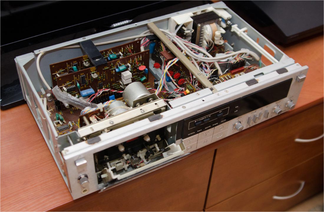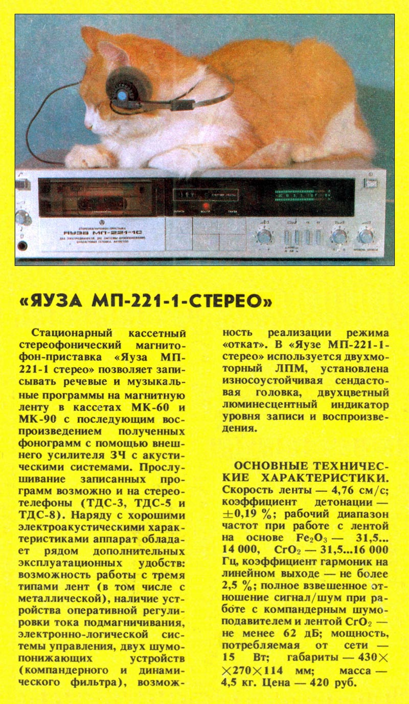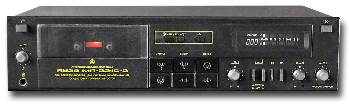 Стереофонические магнитофоны-приставки *Яуза МП-221С*, *Яуза МП-221-1С* и *Яуза МП-221С-2* соответственно с I-кв 1987, 1989 и с 1990 года выпускал Московский ЭМЗ № 1. Стационарный кассетный стереофонический магнитофон-приставка **Яуза МП-221C** позволяет производить запись звуковых программ на магнитную ленту в кассетах МК-60 или МК-90 с последующим их воспроизведением при помощи внешнего усилителя с АС. Прослушать запись можно и на стереотелефоны. МП обладает рядом эксплуатационных удобств: возможность работы с тремя типами магнитных лент, регулировки тока подмагничивания, наличие электронно-логической системы управления, двух шумопонижающих устройств, компандерного и динамического фильтра, режима откат. В МП используется двухмоторный ЛПМ, применена сендастовая головка, двухцветный люминесцентный индикатор контроля уровня записи и воспроизведения. Скорость движения ленты 4,76 см/с. Коэффициент детонации ±0,19%. Рабочий диапазон частот при работе с лентой Fe - 31,5...14000 Гц, Cr - 31,5...16000 Гц. Коэффициент гармоник на ЛВ - 2,5%. Отношение сигнал/шум с СШП и лентой Cr -62 дБ. Потребляемая мощность 15 Вт. Габариты 430 х 270 х 114 мм. Вес 4,5 кг. Цена 420 рублей. Все МП были схожи по конструкции, схеме и параметрам. Но были и отличия, так модель *Яуза МП-221С* в небольшой серии имела английские надписи на лицевой стороне и электродвигатель в ЛПМ стоял отечественного или японского производства. Модель *Яуза 221-1С* отличалась тем что в ней стоял люминесцентный индикатор от усилителя *Радиотехника У101С* и ещё механический счетчик. В модели *Яуза МП-221С-2* стоял уже цифровой счетчик, от *Радиотехники М-201С*.