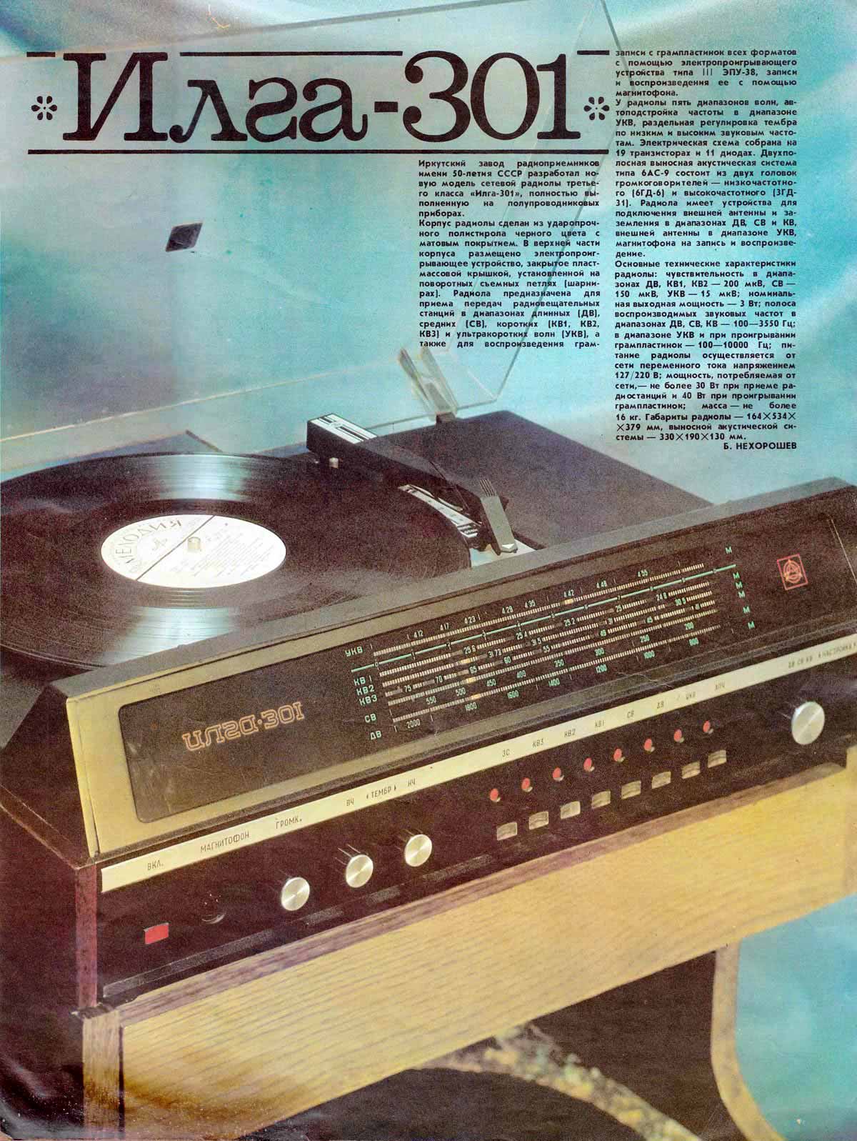 Стационарная транзисторная радиола *Илга-301* с 1979 года выпускалась Иркутским радиозаводом. Радиола **Илга-301** работает в диапазонах ДВ, СВ, КВ (3 поддиапазона), УКВ, и проигрывает грампластинок всех форматов. Модель разработана на базе радиолы **Вега-315**. В ней используется трёхскоростное ЭПУ III-ЭПУ-38. **Илга-301** работает на АС **6АС-9**, где установлены головки: 6ГД-6 и 3ГД-31. В модели имеется АПЧ в диапазоне УКВ, регулировка тембра НЧ и ВЧ, световая индикация рода работы. Чувствительность в АМ 200 мкВ, ЧМ 15 мкВ. Выходная мощность 3 Вт. Диапазон частот в АМ 100...3550 Гц, ЧМ 100...10000 Гц. Потребляемая мощность 14/40 Вт. Габариты модели - 534х377х164 мм. Вес 16 кг. Цена 115 рублей. С 1981 года завод выпускал модель *Илга-301-1*, которая кроме иного оформления АС, другого ЭПУ, небольших изменений схемы и более современных радиоэлементов аналогична базовой.