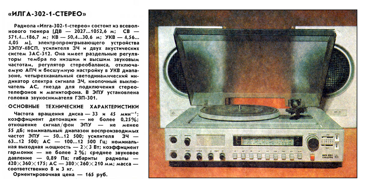 Радиола *Илга-302-стерео* с 1985 года выпускалась Иркутским радиозаводом. Радиола состоит из всеволнового тюнера с диапазонами ДВ, СВ, KB 50,4...30,6 м и УКВ, ЭПУ типа *3-ЭПУ-48СП*, усилителя ЗЧ и двух АС типа *3АС-312* (15АС-204). Модель имеет раздельные регуляторы тембра по НЧ, ВЧ, регулятор стереобаланса, отключаемую АПЧ и БШН в УКВ диапазоне, 4-х канальный светодинамический индикатор спектра звукового сигнала, кнопочный выключатель АС, гнёзда подключения стереотелефонов и магнитофона. В ЭПУ используется звукосниматель ГЗП-301. С 1987 года завод выпускает радиолу **Илга-302-1-стерео** (с 1988 года *Илга РЭ-302-1-стерео*) во всём аналогичную предыдущей модели. Частота вращения диска 33 и 45 об/мин. Коэффициент детонации 0,25%. Отношение сигнал/фон ЭПУ - 55 дБ. Диапазон воспроизводимых звуковых частот: ЭПУ - 50...12500 Гц; усилителя ЗЧ - 63...12500 Гц; АС 100...12500 Гц. Номинальная выходная мощность - 2х3 Вт. Габариты радиолы - 420х360х175, AC - 380х260х210 мм. Вес - 8 и 3 кг соответственно. Цена 165 рублей.