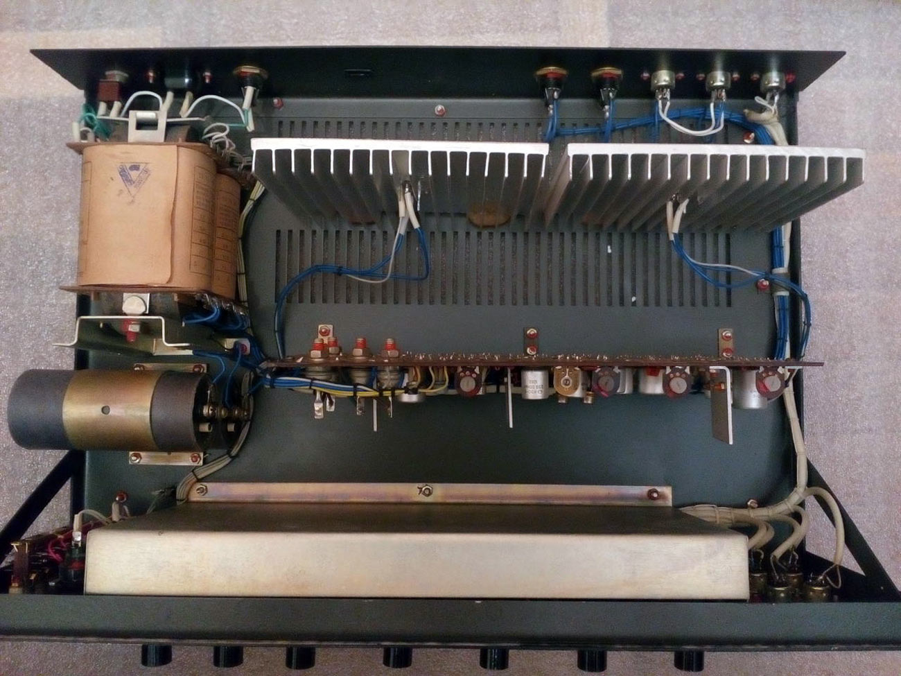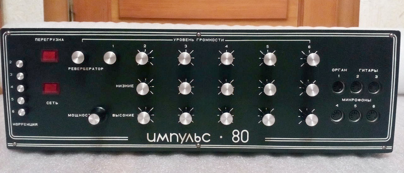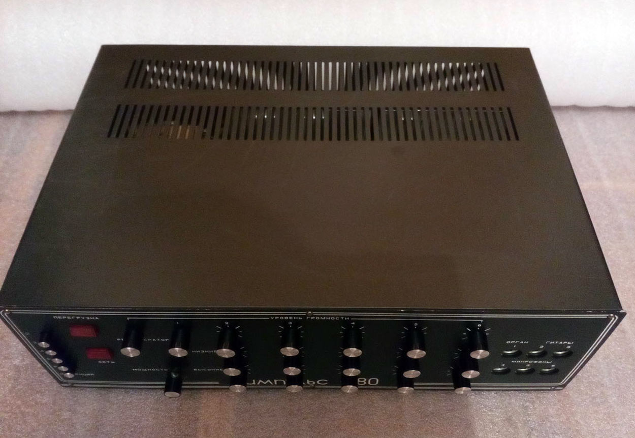 Усилитель НЧ *Импульс-80* выпускался предположительно с 1978 года Херсонским заводом полупроводниковых приборов. Предназначен для усиления низкочастотных сигналов от микрофонов, электрогитар, электроорганов, синтезаторов, магнитофонов и других источников. Рассчитан на работу в составе эстрадных музыкальных ансамблей. Устройство состоит из монофонического усилителя НЧ с микшером шести каналов в одном корпусе, имеет три микрофонных входа, два входа для подключения электрогитар и один для подключения электрооргана. На каждый из 6 первых входов, предусмотрена регулировка уровня громкости, а так же тембра по высшим и низшим звуковым частотам. Есть выход на *петлю* эффектов с регулировкой уровня и два выхода на акустические системы. В усилителе предусмотрена электронная защита от короткого замыкания нагрузки, имеется индикатор перегрузки, позволяющий следить за режимом его работы. Выпускался усилитель в двух вариантах внешнего оформления и с двумя АС (2 типа). Номинальная выходная мощность усилителя 75 Вт на нагрузке 6 Ом. Максимальная выходная мощность 150 Вт. Номинальный диапазон частот усили теля 30...20000 Гц. КНИ 1%. Диапазон регулировки тембра ±12 дБ. Потребляемая мощность не более 300 Вт.