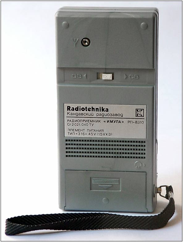 Портативный радиоприёмник *Имула РП-8310* с 1986 года выпускал Кандавский радиозавод. (Имула - левый приток реки Абава, Латвия.) Радиоприёмник представляет собой малогабаритный СВ, ДВ супергетеродин, собранный на интегральной микросхеме К174ХА10. Конструкция и схема модели кроме оформления аналогична приёмнику этого же завода *Селга-309*. Приём производится на магнитную антенну, но есть возможность подключения и внешней антенны. Чувствительность на ДВ 2,5, СВ 1,3 мВ/м. Избирательность по соседнему каналу при расстройке на 9 кГц около 30 дБ. Диапазон воспроизводимых частот 450...4000 Гц. Номинальная выходная мощность 150 мВт. Питание 3 элемента 316. Габариты приёмника 74х150х36 мм, вес с питанием 340 г. Завод выпускал и экспортный приёмник с наименованием "Selga R-8310". Одновременно на Кубе выпускался этот же радиоприемник, но под именем Pionero. Одновременно с радиоприемником Имула, на этом же заводе "Радиотехника" выпускался радиоприемник Selga-309, который был построен точно по такой же схеме. В определенный момент начался дефицит микросхем К174ХА10 и на заводе была разработана транзисторная версия радиоприемника Selga -309Т (если не ошибаюсь в 1991 году, а индекс "Т" обозначает - Транзисторная). Характеристики транзисторной версии в точности повторяли версию на микросхеме.