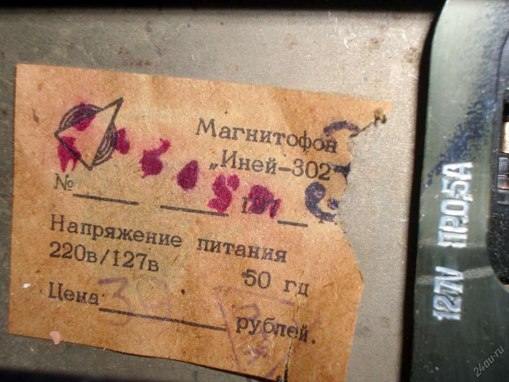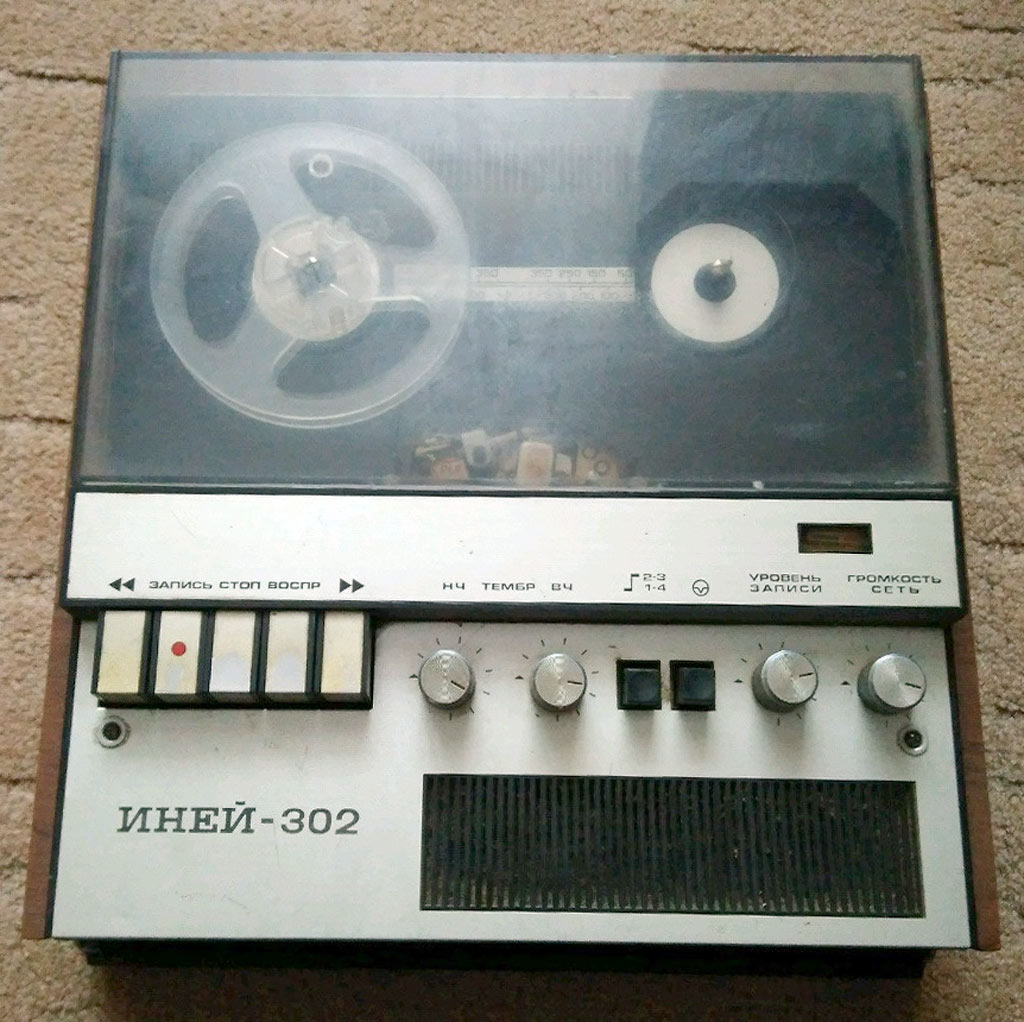 Катушечный магнитофон *Иней-302* с 1972 года выпускал Новосибирский электромеханический завод. Транзисторный четырёхдорожечный магнитофон 3 класса **Иней-302** предназначен для записи и воспроизведения фонограмм на магнитной ленте А4402-6, на скорости 9,53 см/сек. Магнитофон позволяет производить запись с микрофона, радиоприёмника, телевизора, радиосети, звукоснимателя, ЭПУ и магнитофона. Уровень записи контролируется стрелочным индикатором. К магнитофону можно подключить внешний усилитель ЗЧ с АС. Потребляемая мощность 40 Вт. Диапазон рабочих частот 63...12500 Гц. Время записи на катушках № 15 на одной дорожке 65 минут, на 4-х дорожках 4 часа 20 мин. Время перемотки при использовании катушки № 15 не более 180 секунд. Регулировка тембра по НЧ 10 дБ, по ВЧ 14 дБ. Громкоговорителей 1ГД-40 - 2 шт. Номинальная выходная мощность 2 Вт. Габариты магнитофона - 140х355х375 мм. Масса 9,5 кг.