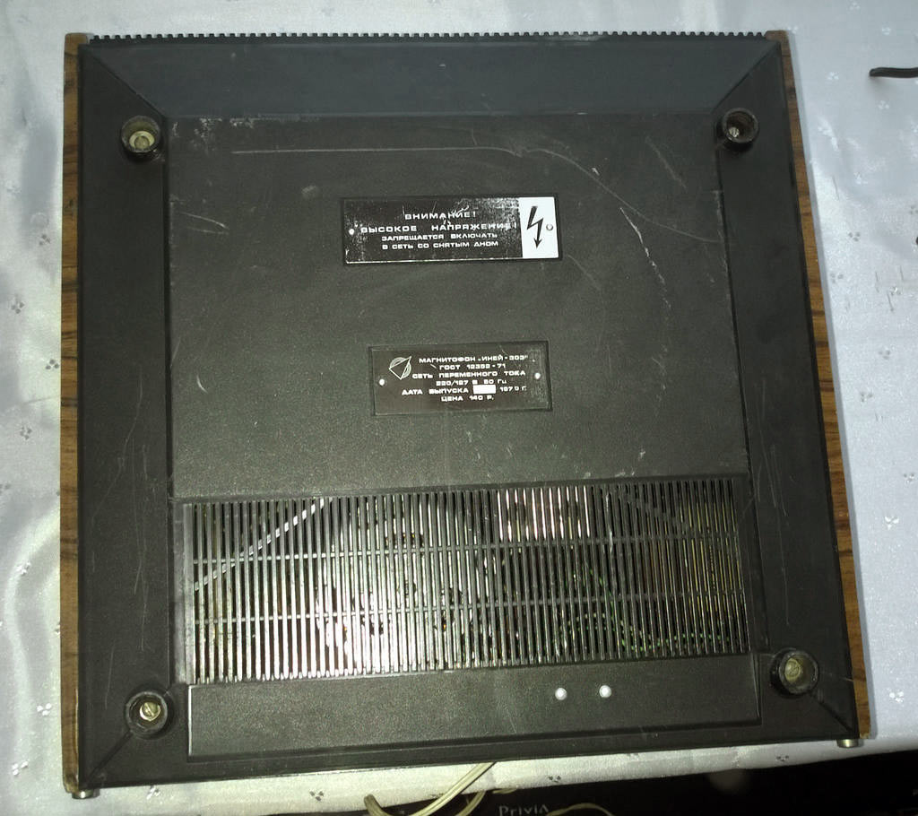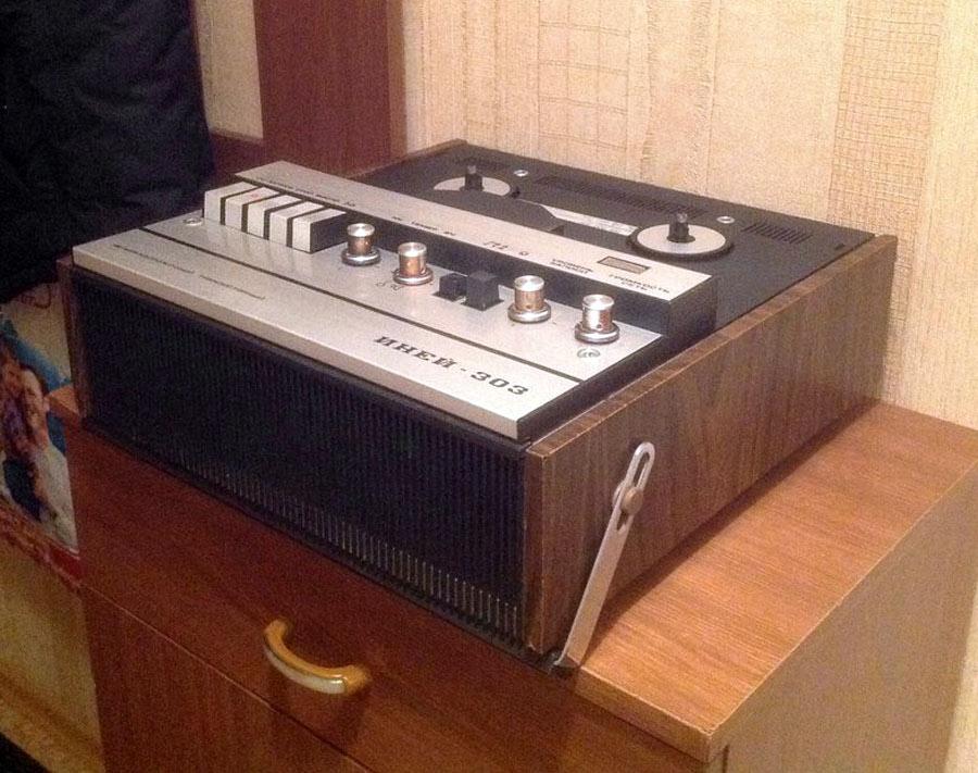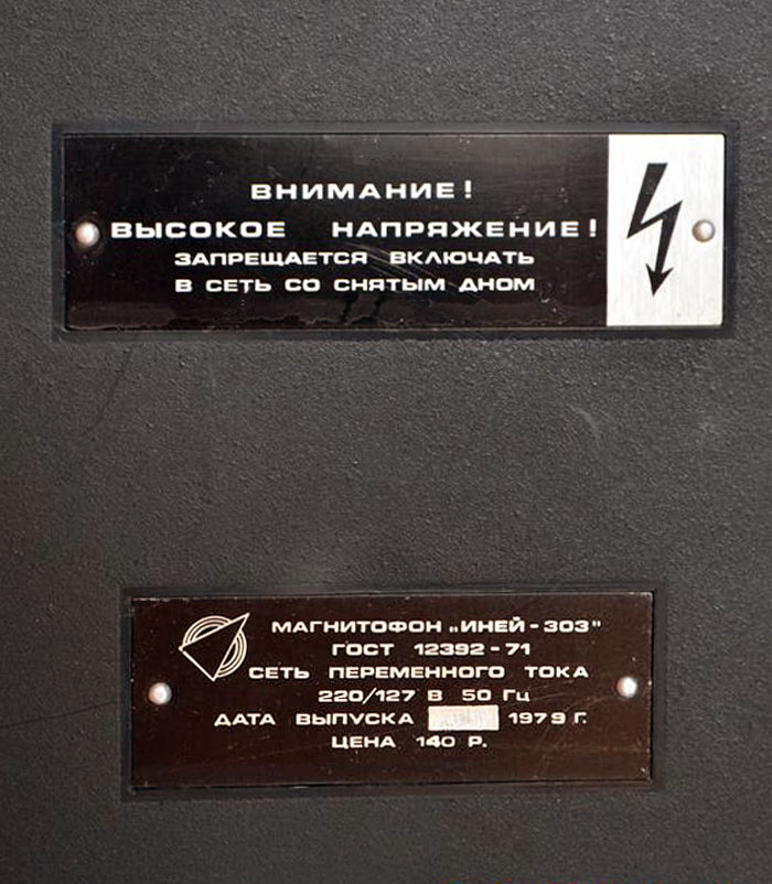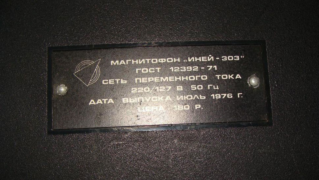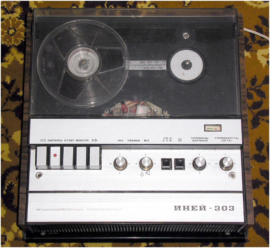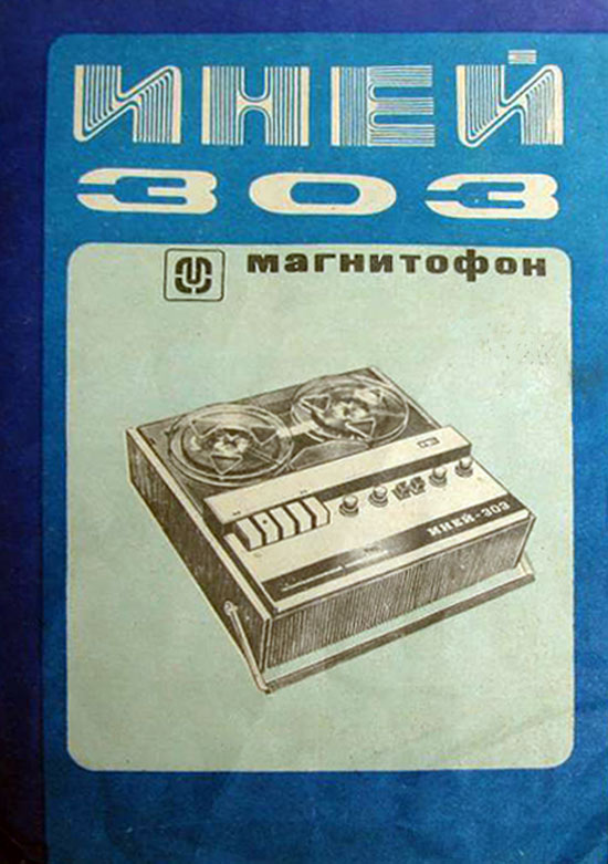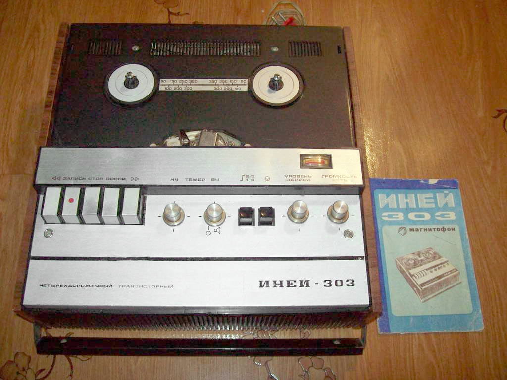 Катушечный транзисторный магнитофон *Иней-303* с 1976 года выпускал Новосибирский ЭМЗ. Магнитофон создан на основе предыдущей модели **Иней-302** и предназначен для записи и воспроизведения фонограмм на магнитной ленте типа А4407-6Б и скорости 9,53 см/сек. Диапазон рабочих звуковых частот 63...12500 Гц. Номинальная выходная мощность 1,5 Вт, максимальная 3 Вт. Габариты магнитофона 140х355х375 мм. Масса 9,5 кг.