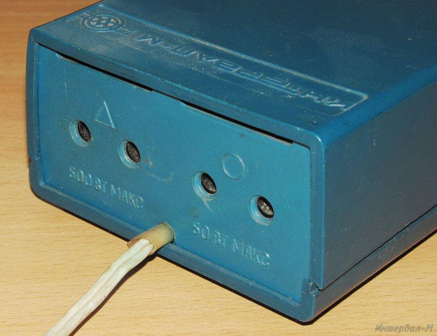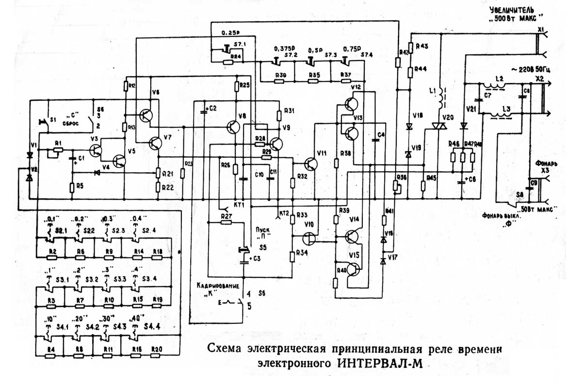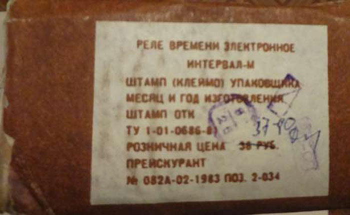 Реле времени электронное *Интервал-М* выпускалось с 1987 года. В реле применено бесконтактное коммутирующее устройство, обеспечивающее реле высокую стабильность и надежность в работе, также предусмотрено пятиступенчатое переключение мощности лампы до 500 Вт. Диапазон выдержек: 0,1...111 секунд. Авторство фотографий утеряно.