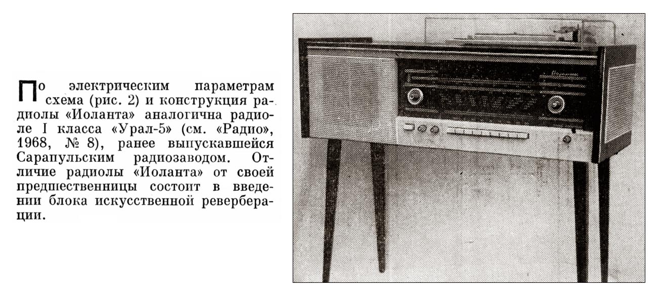 Радиола сетевая ламповая *Иоланта* с осени 1968 года выпускалась Сарапульским заводом имени Орджоникидзе. Радиола 1-го класса **Иоланта** (в переводе с удмуртского означает фиалка), внутризаводское наименование модели *Урал-7*, аналогична радиоле **Урал-6** того же Сарапульского завода и отличается только добавочным транзисторным блоком для искусственной реверберации в звучании.