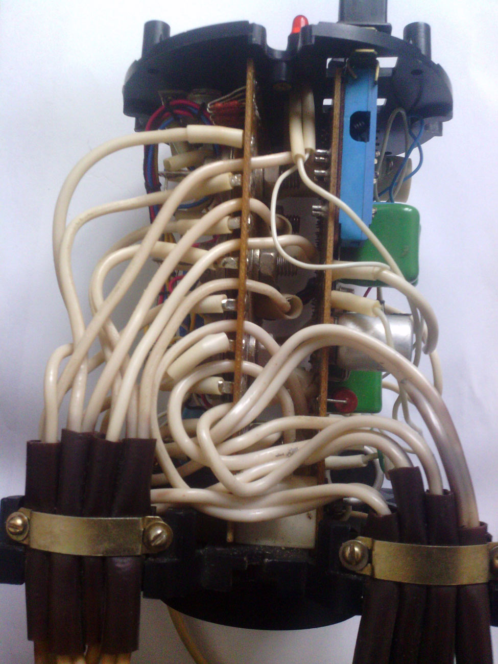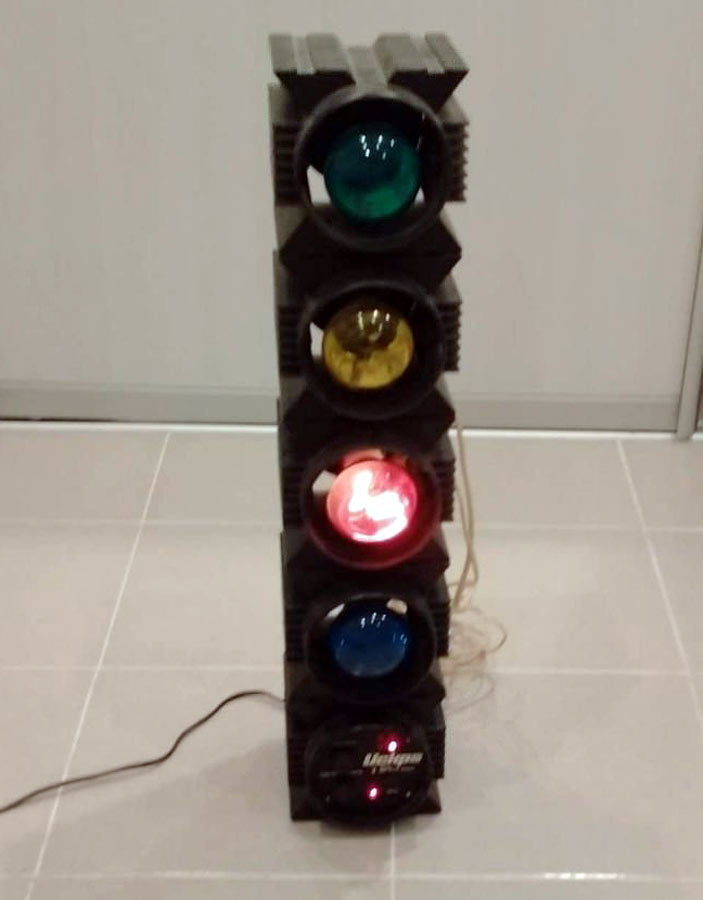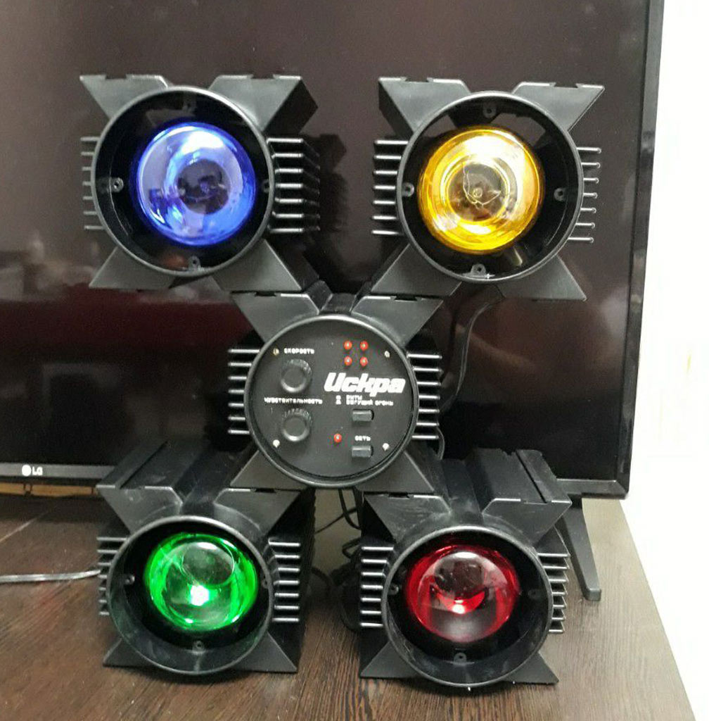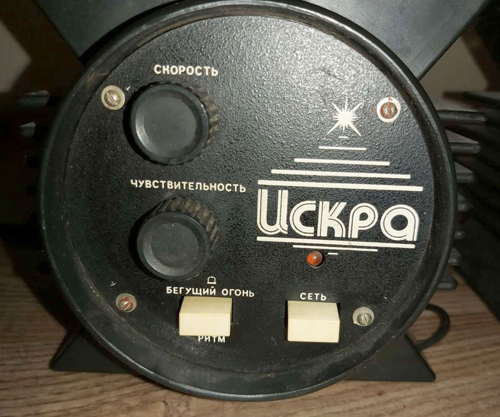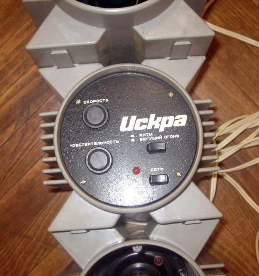 Цветомузыкальная приставка *Искра* выпускалась предположительно с 1988 года Уфимским ПО имени С.М.Кирова. Предположительно с 1989 года выпускалась ЦМП *Искра-2* и так же предположительно с 1990 года ЦМП *Искра-2М*. ЦМП представляет собой 8-ми канальное светодинамическое устройство. ЦМП предназначена для обычного (сигналом ЗЧ через встроенный микрофон) или автоматического сопровождения музыкальных фонограмм с помощью эффекта *бегущие огни* с регулируемой скоростью. Питание от сети переменного тока 220 В. Мощность ламп каждого канала 100 Вт. Габариты любого из 9-ти блоков 130 х 140 х 170 мм.