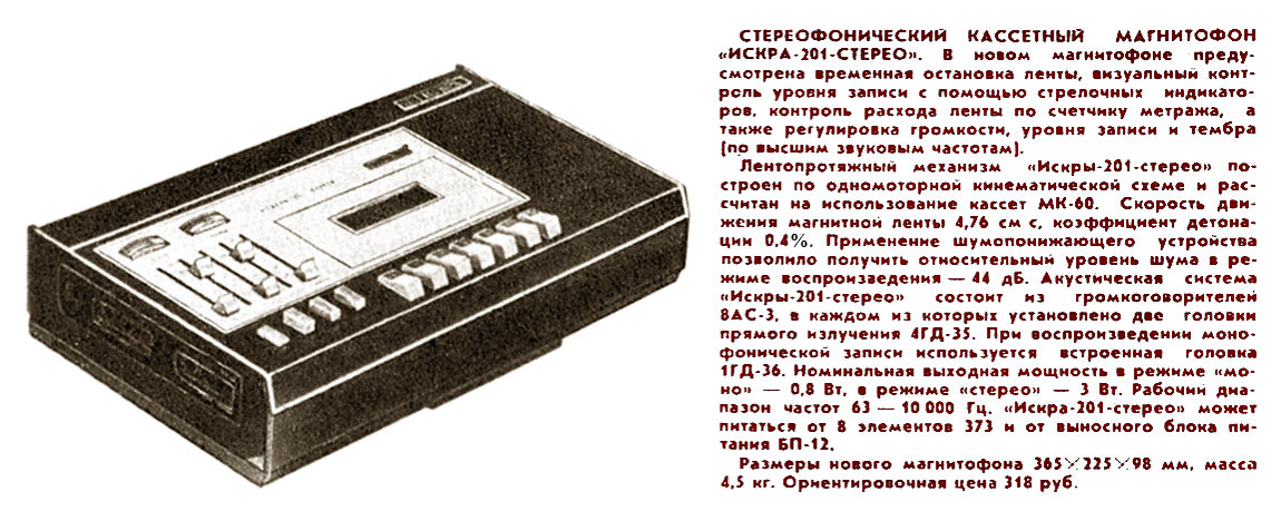 Стереофонический кассетный магнитофон *Искра-201-стерео* с 1975 года подготовил к выпуску Запорожский ЭМЗ *Искра*. Магнитофон предназначен для записи музыкальных и речевых фонограмм на компакт кассеты. В модели имеется временная остановка ленты, визуальный контроль уровня записи с помощью стрелочных индикаторов, контроль расхода ленты по счетчику метража, а также регулировка громкости, уровня записи и тембра по ВЧ. ЛПМ магнитофона построен по одномоторной кинематической схеме и рассчитан на использование кассет МК-60. Скорость движения ленты 4,76 см/с, коэффициент детонации 0,4. Шумопонижающее устройство позволило получить относительный уровень шума в режиме воспроизведения 44 дБ. Акустическая система **Искры-201-стерео** состоит из двух акустических систем 8АС-3, в каждой из которых установлено по две головки прямого излучения 4ГД-35. При воспроизведении монофонической записи используется встроенная головка 1ГД-36. Номинальная выходная мощность в режиме моно 0,8 Вт, в режиме стерео 3 Вт. Рабочий диапазон частот звука 63...10000 Гц. Магнитофон может питаться от 8-ми элементов 373 и от сети 220 В с помощью выносного блока питания **БП-12**. Размеры магнитофона 365х225х98 мм, масса без элементов 4,5 кг. Цена 318 рублей. С 1977 года магнитофон выпускался под наименованием *Весна-201-стерео*.