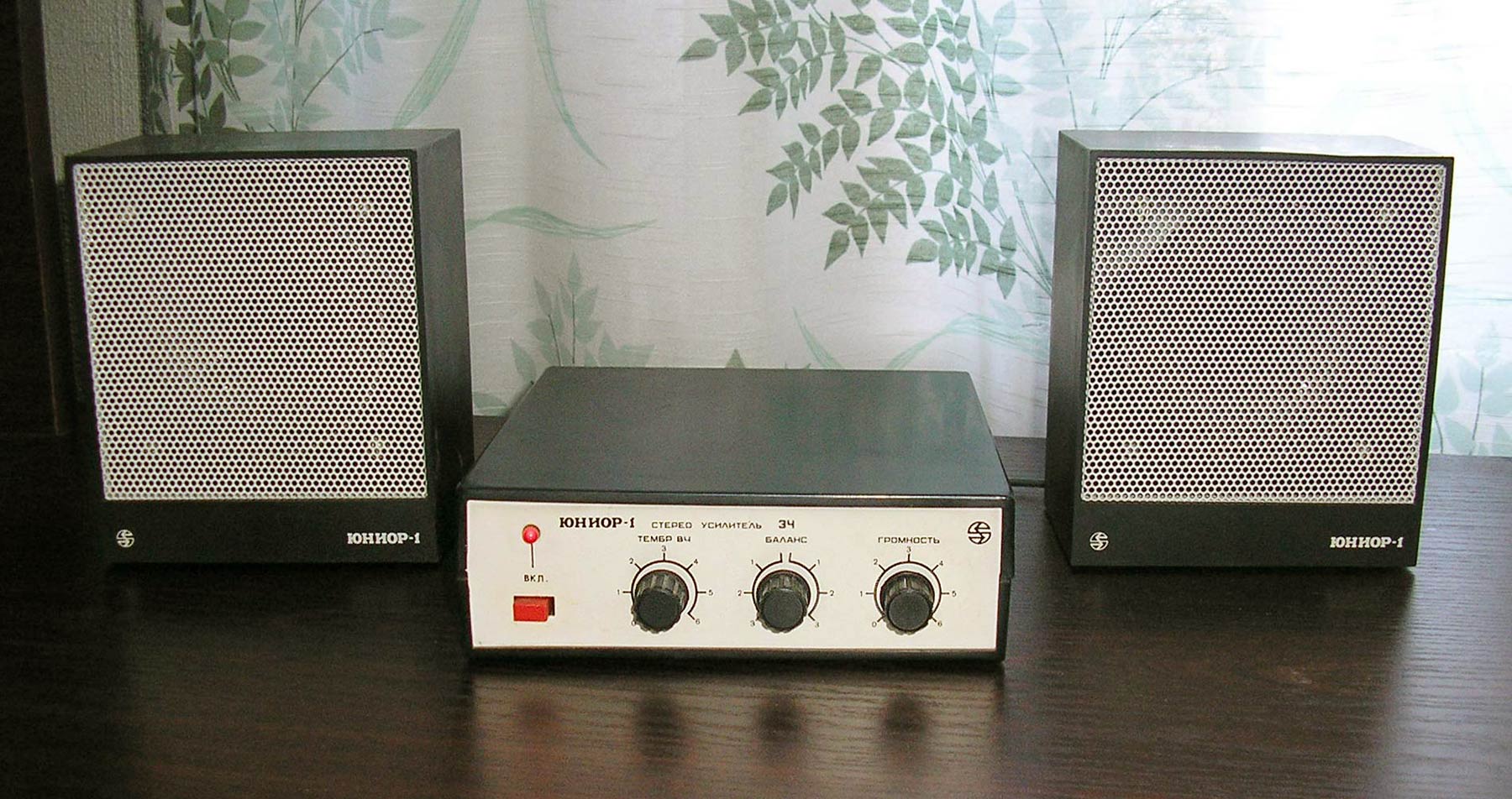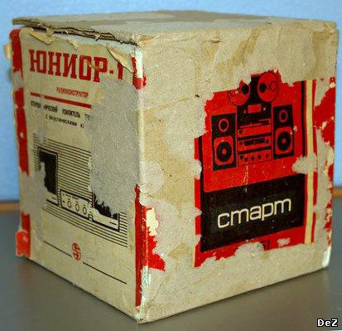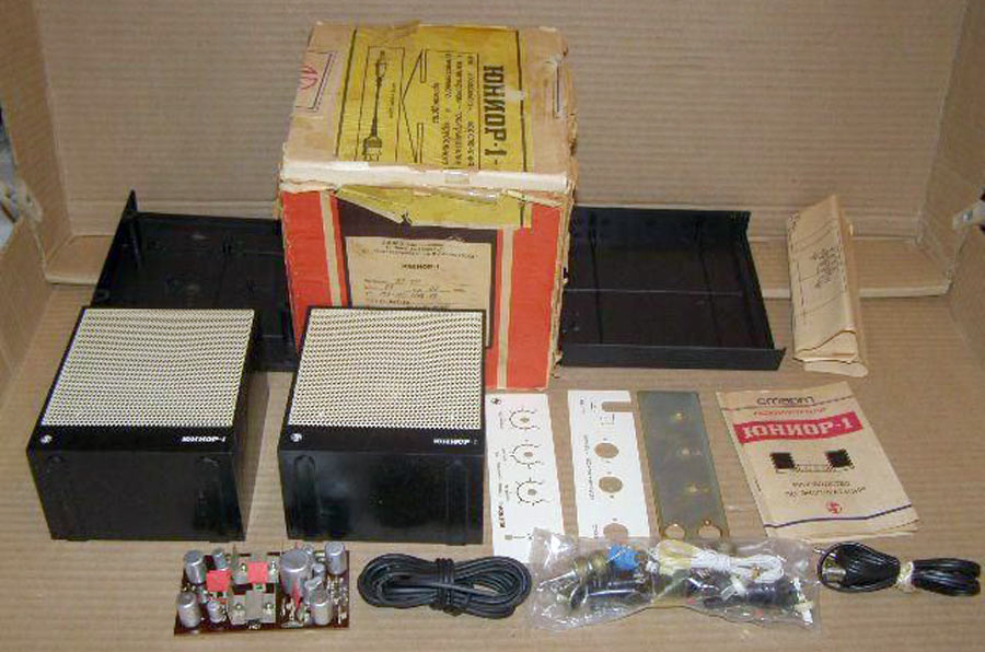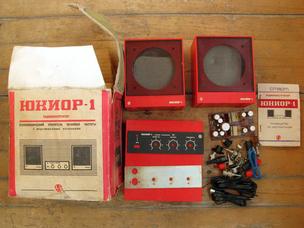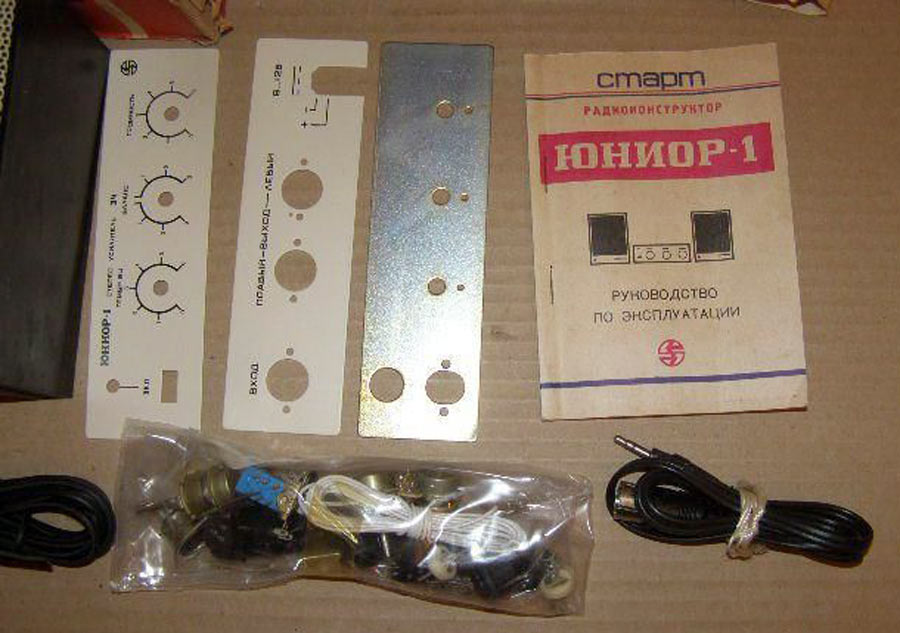 Радиоконструктор *Юниор-1* (Усилитель ЗЧ) с 1989 года выпускал Каменец-Подольский завод *Электроприбор*. Радиоконструктор **Юниор-1** входящий в серию радиоконструкторов **Старт** позволяют собрать малогабаритный стереофонический усилитель ЗЧ, оснащённый АС. Усилитель собран на микросхемах К174УН-7 и обеспечивает выходную мощность до 2 Вт на канал. В каждой из АС используются головки 2ГДШ-1 или 1ГДШ-4. В набор входит корпус усилителя с передней панелью и корпуса АС. Источник питания в набор не входит. Цена РК 25 рублей. Набор усилителя ЗЧ **Юниор-2** выпускаемый с начала 1992 года ничем, кроме розничной цены не отличается от базового набора.