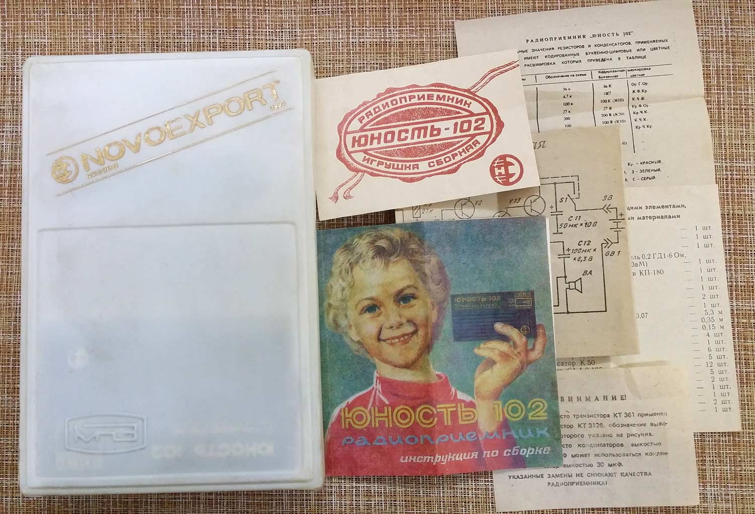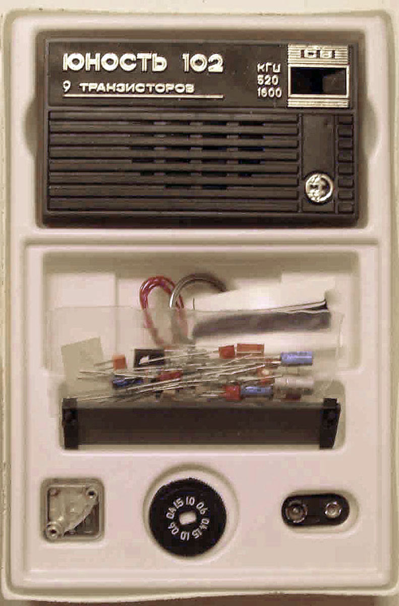 Транзисторный радиоприёмник *Юность-102* из конструктора с 1988 года выпускал 1-й Московский приборостроительный завод. Радиоприёмник предназначен для начинающих радиолюбителей в возрасте от 10 лет. Он представляет собой набор радиодеталей и компонентов, необходимых для сборки радиоприёмника по схеме прямого усиления, работающего в диапазоне СВ. Правильно собранный и настроенный приёмник имеет чувствительность около 10 мВ/м и селективность 5...7 дБ. Номинальная выходная мощность составляет 80 мВт, максимальная 150 мВт. Диапазон воспроизводимых звуковых частот 350...4000 Гц. Цена набора с начала выпуска была 11 рублей, затем с весны 1991 года 19 рублей, уже с осени 1991 года уже 33 рубля. Из-за безостановочной инфляции в стране тех лет, с середины 1992 года набор *Юность-102* был снят с производства.