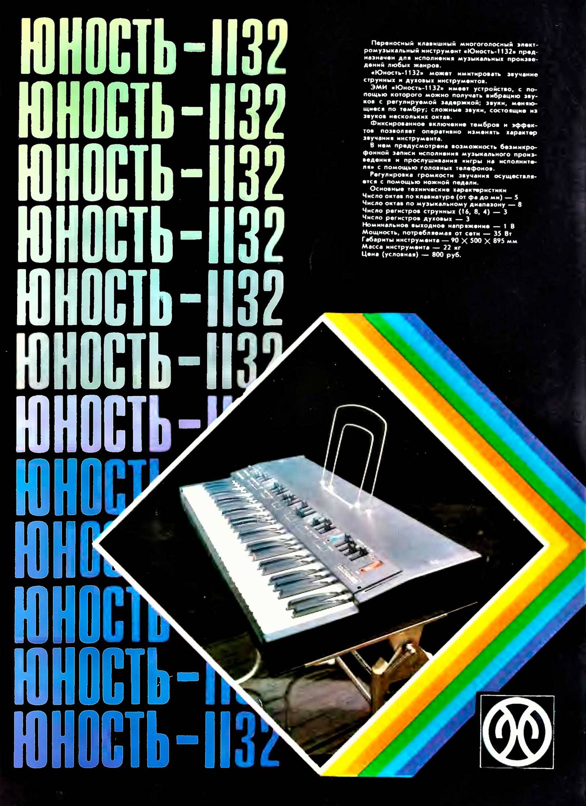 Электромузыкальный инструмент *Юность-1132* с 1987 года выпускал Муромский завод РИП (Радио Измерительных Приборов). ЭМИ иммитирует звучание духовых и струнных инструментов и может быть использован в составе эстрадных ансамблей. Он позволяет получить такие эффекты как: частотное вибрато с плавной регулировкой по глубине и частоте; перкуссию с плавной регулировкой уровня сигнала; фэйзер с фиксированным включением и плавной регулировкой скорости фазового сдвига. В инструменте предусмотрены: подстройка музыкального диапазона; транспонирование музыкального строя на одну октаву; фиксированное включение тембров и эффектов; плавная регулировка громкости звучания головных телефонов. Основные технические характеристики: число октав по музыкальному диапазону - 8; по клавиатуре - 5; число регистров синтеза звука - 6; номинальное выходное напряжение - 1 В; потребляемая мощность 35 Вт. Габариты ЭМИ (без ножек) 865х420х125 мм. Вес 22 кг.