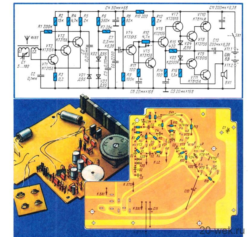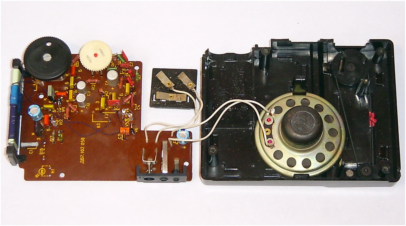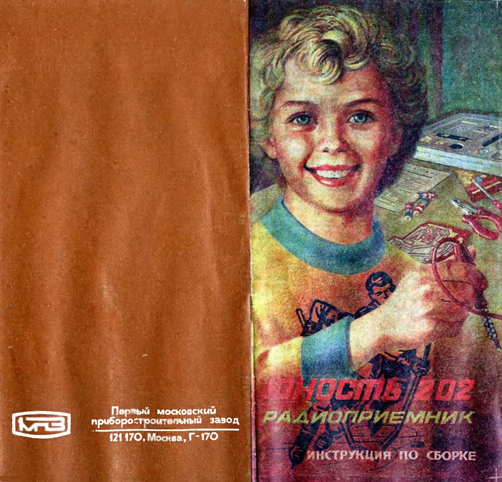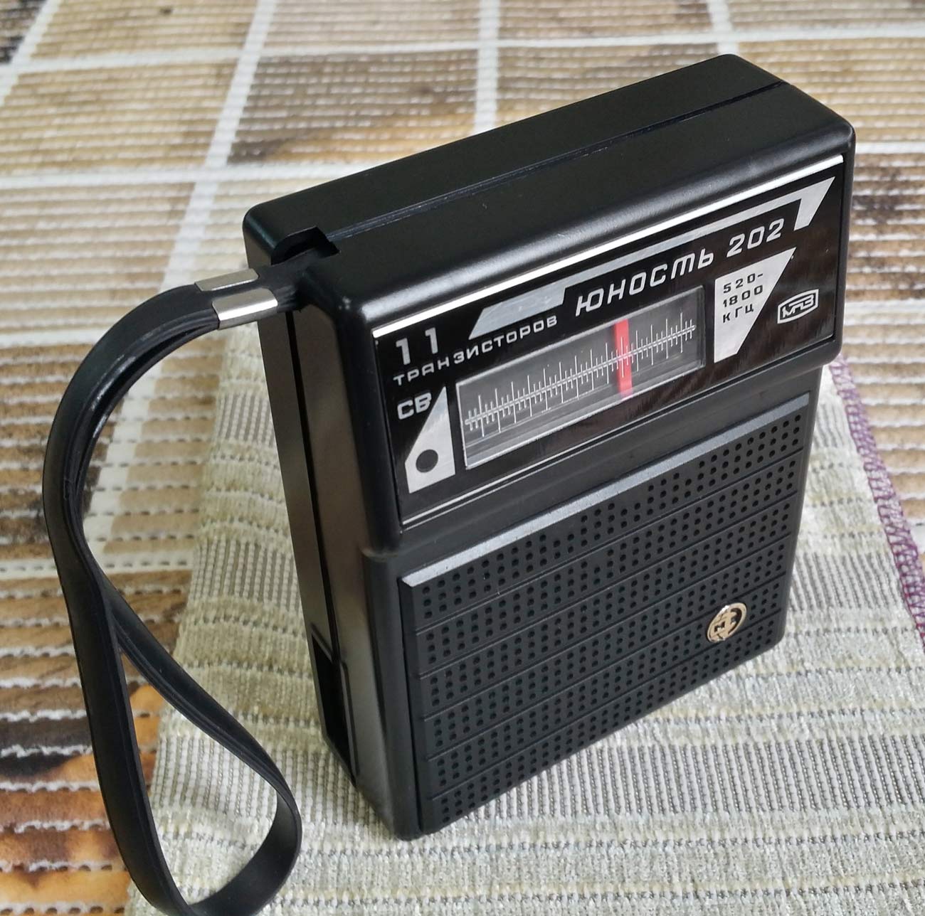 Детский радиоприёмник *Юность-202* из набора радиоконструктора с 1988 года выпускал Первый московский приборостроительный завод. Истрия модели: Это самый интересный конструктор выпускавшийся в СССР. Дело в том, что автором схемы этого приемника обыкновенный читатель журнала Радио, а схема родилась в результате объявленного конкурса на улучшение/модернизацию предыдущей модели конструктора "Юность-105". По результатам конкурса была выбрана схема одного из читателей журнала Радио, В.Верютина и эта схема и пошла в серию. Примечательно, что в журнале была опубликована схема на транзисторах КТ315Б, а серию пошла модель с транзисторами КТ315А, и это было не лучшим решением, приемник часто возбуждался при работе с подсевшими элементами питания. Схема из журнала Радио (№12/1987) Схема из набора конструктора: Всю историю о конструкторе можно почитать в статье. Набор-конструктор позволяет из радиодеталей, элементов, узлов, печатной платы и футляра собрать высокочувствительный радиоприёмник, работающий в диапазоне средних волн 520...1600 кГц. Чувствительность собранного и настроенного приёмника около 5 мВ/м. Номинальная выходная мощность 120 мВт, максимальная 250 мВт. Питание - 4 элемента АА. Ток покоя 10 мА. Диапазон воспроизводимых звуковых частот 300...4000 Гц. Первоначальная цена набора была 14 рублей, с осени 1991 года 22 рубля 50 копеек. С 1992 года выпуск набора радиоконструктора *Юность-202* в связи с усилившейся инфляцией был прекращён.