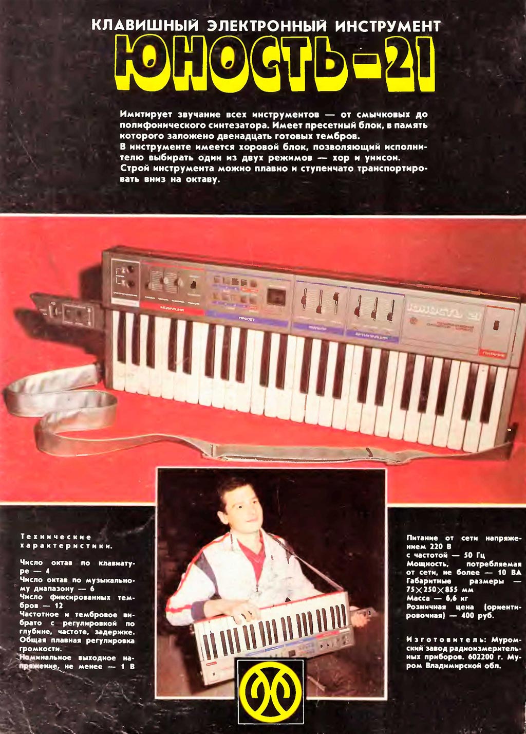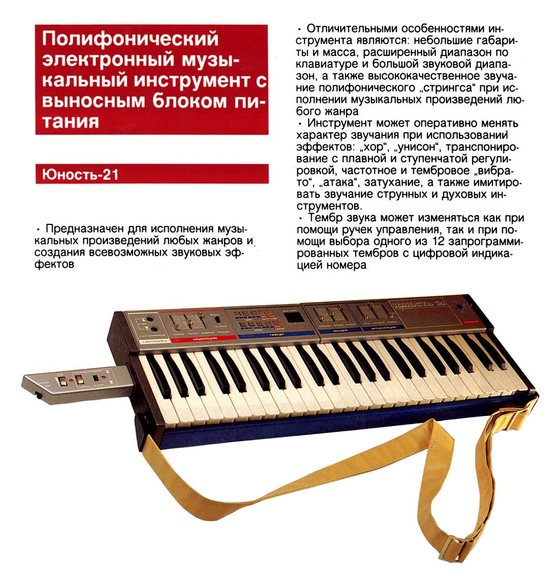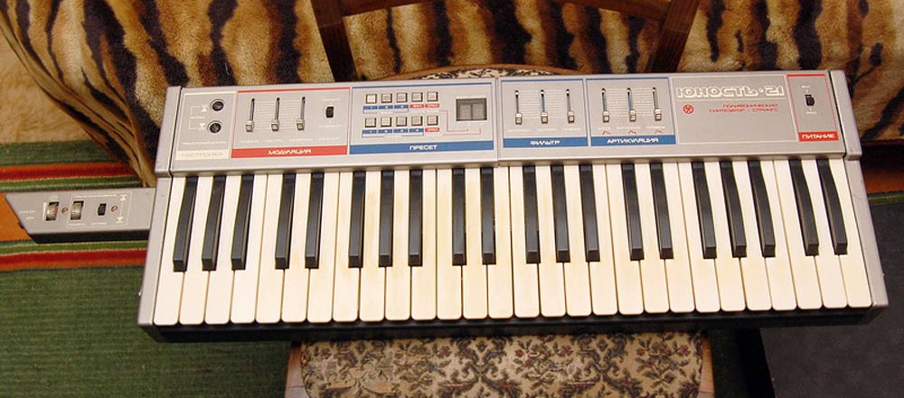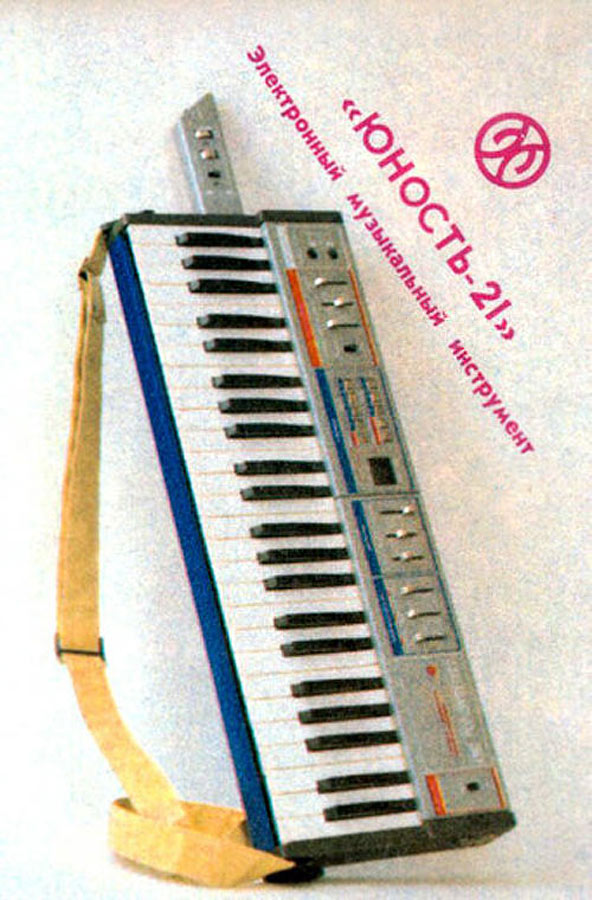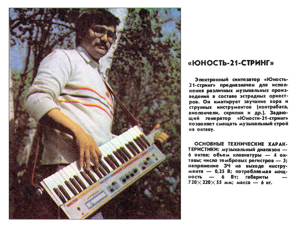Электронный синтезатор *Юность-21* (Стринг) выпускал с 1986 года Муромский завод радиоизмерительных приборов. Синтезатор предназначен для исполнения различных музыкальных произведений в составе эстрадных оркестров. Имитирует звучание хора и струнных инструментов (контрабаса, виолончели, скрипки и др.). Задающий генератор синтезатора позволяет смещать музыкальный строй на октаву. Основные технические характеристики: музыкальный диапазон 6 октав; объём клавиатуры 4 октавы; число тембровых регистров 3; напряжение ЗЧ на выходе инструмента 0,25 В; потребляемая мощность 6 Вт; габариты 720х220х55 мм; вес 6 кг.