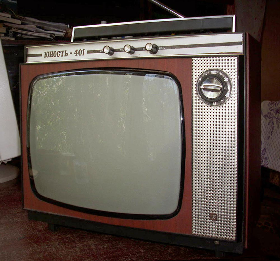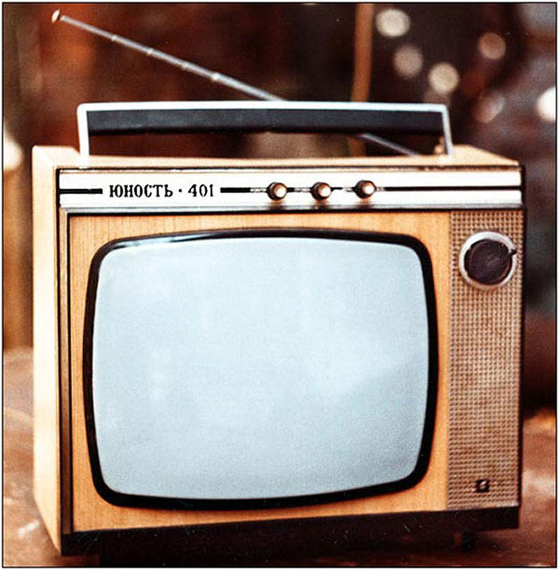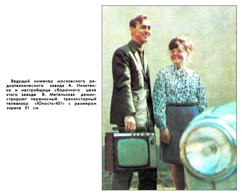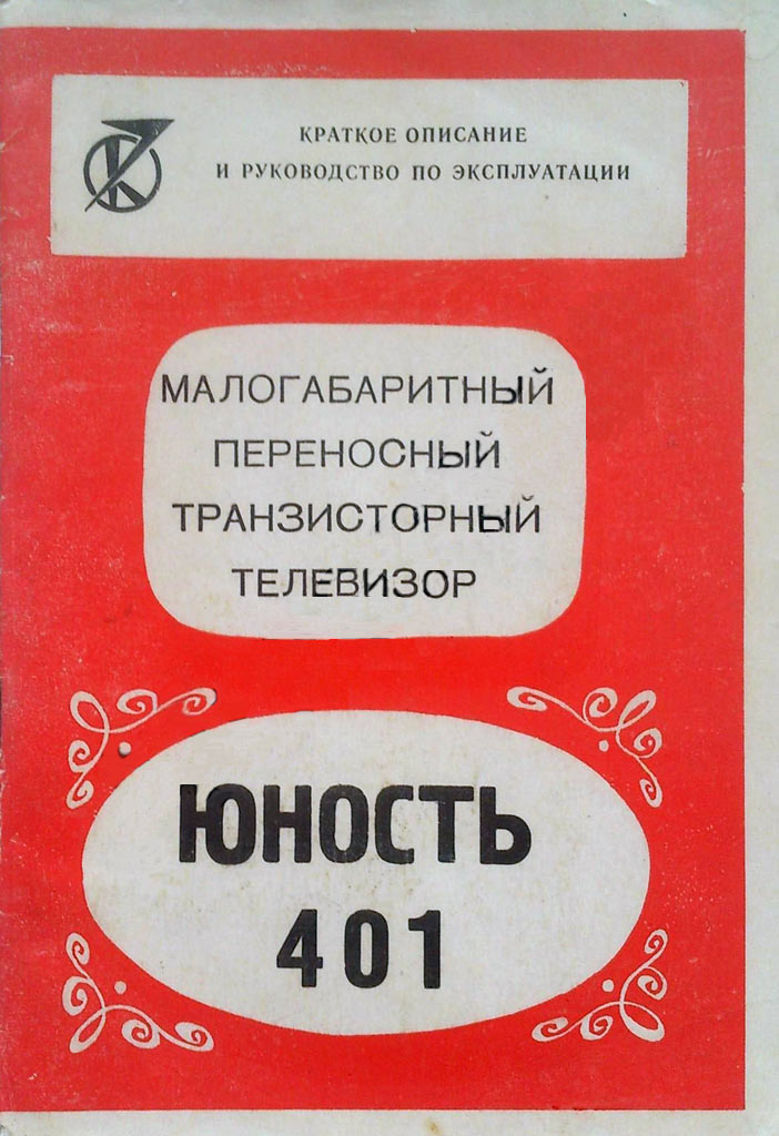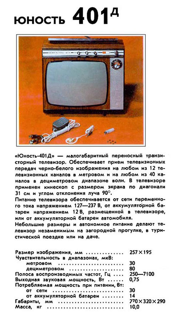 Телевизионный приёмник ч/б изображения *Юность-401/Д* с 1972 года выпускал Московский радиотехнический завод. Переносной телевизор 4 класса **Юность-401** (ПТ-31-IV-1) предназначен для приёма телевизионных программ в МВ, а при установке селектора каналов СКД-20 и в ДМВ диапазоне. Телевизор **Юность-401Д** уже имеет блок СКД-20. Телевизор обеспечивает приём програм на расстоянии до 100 км от телестудии. В нём применён кинескоп 31ЛК4Б, с углом отклонения луча 90°. В схеме аппарата имеется АРУ и АПЧ и Ф. Чувствительность телевизора 100 мкВ. Чёткость в центре экрана 400 линий. Номинальная выходная мощность - 0,75 Вт. Полоса воспроизводимых звуковых частот - 200...7100 Гц. АС состоит из громкоговорителя 0,5ГД-30, есть гнездо для головных телефонов с отключением АС. Питается телевизор от сети, аккумулятора или источника, напряжением 12 вольт. Потребляемая мощность при питании от сети 30 Вт, источника постоянного тока 14 Вт. Футляр из пластмассы, отделан плёнкой под ценные породы дерева с металлизацией. Габариты телевизора - 376 х 315 х 260 мм. Масса 10 кг. Цена модели 280 рублей.
