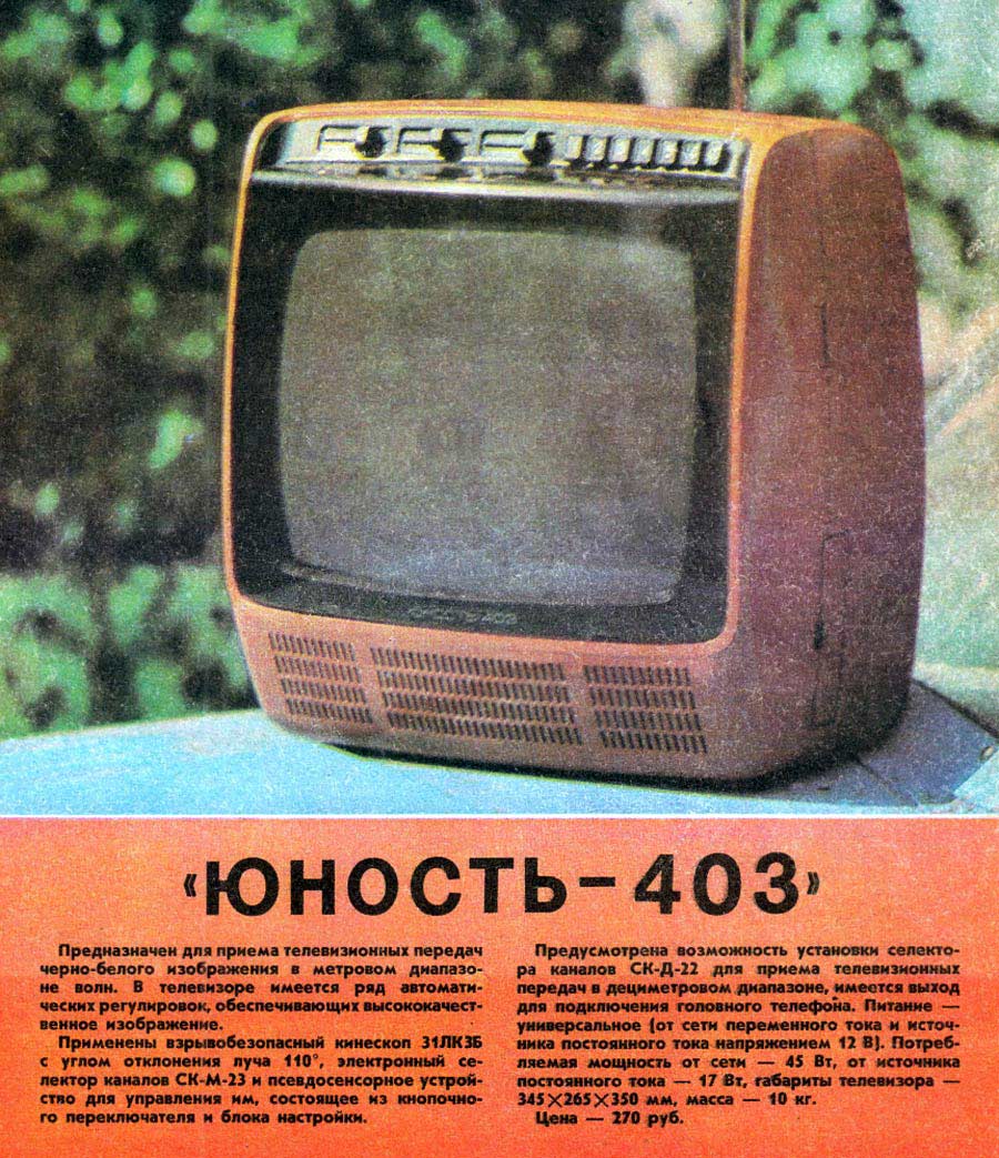 Телевизионный приёмник чёрно-белого изображения *Юность-403/Д* с 1979 года полностью подготовил к производству Московский радиотехнический завод. Малогабаритный телевизор **Юность-403** предназначен для приёма передач в МВ, а с индексом *Д* и в ДМВ диапазоне. В схеме имеется ряд автоматических настроек обеспечивающих качественное изображение. В телевизоре применён кинескоп типа 31ЛКЗБ с углом отклонения луча 110° и селектор каналов типа *СК-М-23* с псевдосенсорным устройством управления состоящее из 6-ти кнопочного переключателя и блока для настройки. В телевизоре без индекса имеется возможность установки селектора *СК-Д-22* для приёма и в ДМВ диапазоне. Есть разъём для головного телефона. Номинальная выходная мощность канала звука 0,25 Вт. Диапазон воспроизводимых частот 250...7100 Гц. Питание от сети 220 вольт или источника 12 В. Потребляемая мощность от сети 45 Вт, источника постоянного тока 17 Вт. Размеры телевизора 345х265х350 мм. Его масса 10 кг. Цена телевизора без индекса 245 рублей. С индексом *Д* - 270 рублей. Телевизор *Юность-403/Д* был выпущен опытной партией в несколько десятков экземпляров.