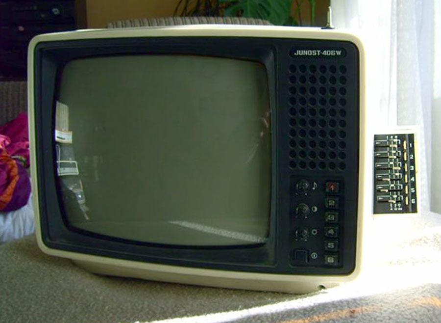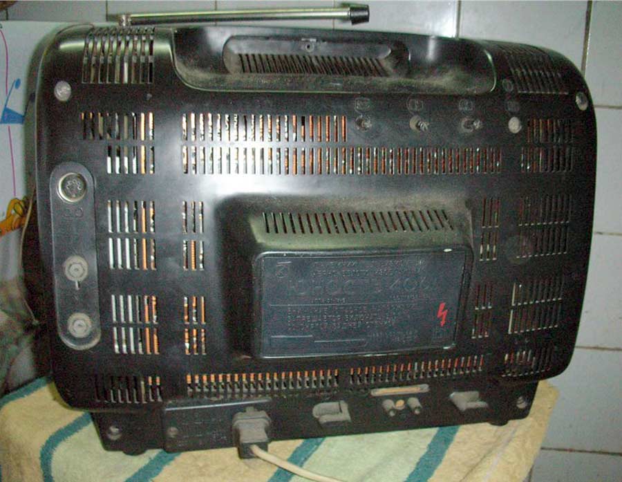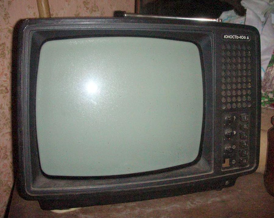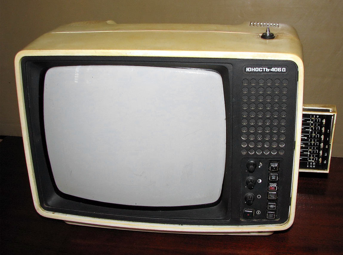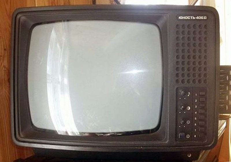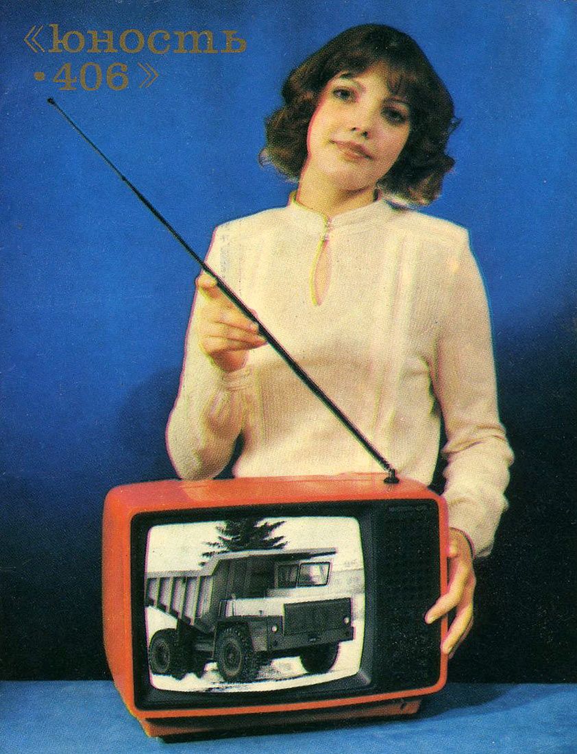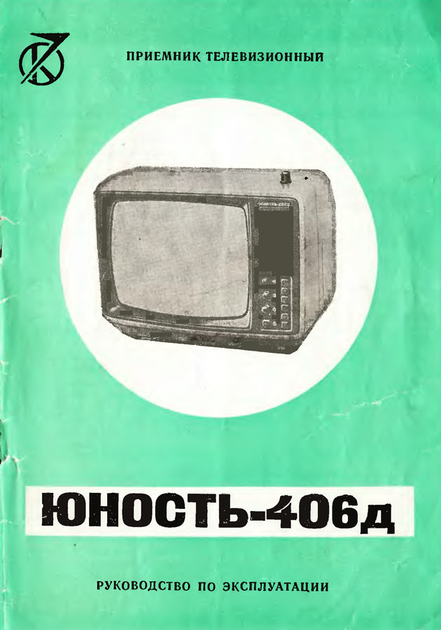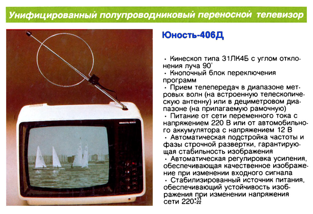 Телевизионный приёмник *Юность-406/Д* с 1987 года выпускал Московский радиотехнический завод. Переносной унифицированный телевизор **Юность-406/Д** (УПТИ-31-IV-7/6) предназначен для работы в МВ или в МВ и ДМВ диапазоне. В ТВ имеется ряд автоматических регулировок, обеспечивающих высококачественное изображение. В телевизоре применён взрывобезопасный кинескоп 31ЛК4Б с углом отклонения луча 90°, селектор каналов МВ диапазона *СК-М-23*, селектор каналов ДМВ диапазона *СК-Д-22*, 6-кнопочный переключатель для выбора программ. Предусмотрена возможность подключения магнитофона для записи звука передач, прослушивания его на телефоны. ТВ имеет встроенную телескопическую антенну для приёма передач ДМВ диапазона, имеется и рамочная антенна. Питание от сети переменного тока или источника постоянного тока 12 В. Футляр телевизора изготовлен из ударопрочного полистирола в разнообразных вариантах цветового сочетания. Размер изображения 202х254 мм. Чувствительность в диапазонах МВ 55 мкВ, ДМВ 90 мкВ. Диапазон воспроизводимых звуковых частот 250...7100 Гц. Номинальная выходная мощность канала звука 0,5 Вт. Потребляемая мощность от постоянного тока 17 Вт от сети 33 Вт. Габариты телевизора 307х392х305 мм. Масса 9 кг. Небольшая партия телевизоров имела 8-кнопочный селектор для выбора телевизионных программ в МВ и ДМВ.