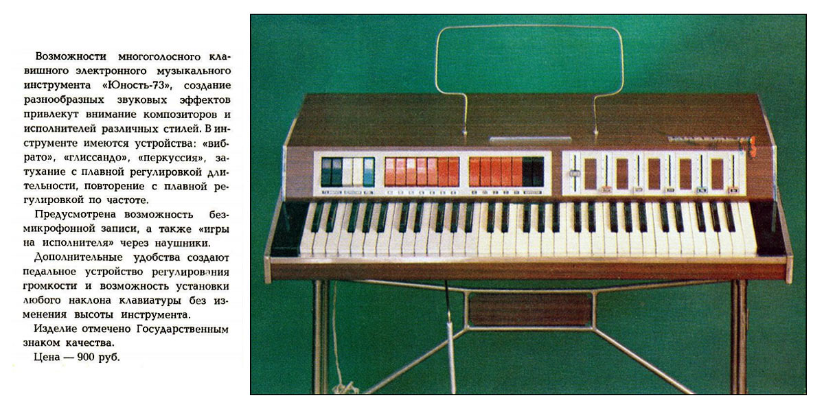 Электронный музыкальный инструмент *Юность-73* с 1973 года выпускал Муромский завод РИП. Государственный знак качества - оценка больших возможностей многоголосного клавишного ЭМИ - *Юность-73*. В ЭМИ имеются устройства: *вибрато*, *глиссандо*, *перкуссия*, затухание с плавной регулировкой длительности, повторение с плавной регулировкой по частоте. Громкость звучания ЭМИ регулируется педальным устройством. Наклон для клавиатуры устанавливается исполнителем. Запись исполнения музыкального произведения можно вести без микрофона, можно прослушать звучание на головные телефоны. Число октав по музыкальному диапазону 8, по клавиатуре 5. Число клавиш 61. Число регистров синтеза звуков 6. Диапазон звуков от *до* контроктавы до *си* пятой октавы. Потребляемая мощность 35 Вт. Габариты ЭМИ без ножек 972х524х280 мм, с ножками 972х551х914 мм. Масса без футляра 40 кг, с футляром 65 кг. Питание - 220 В.