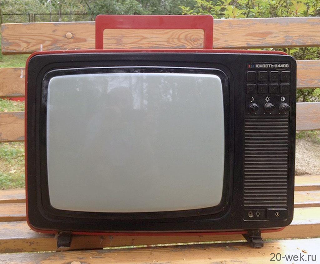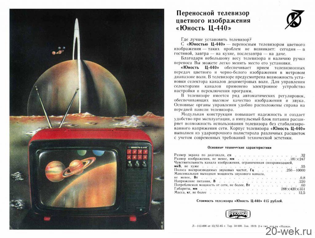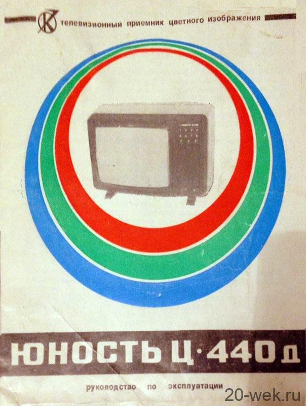 Телевизионный приёмник цветного изображения *Юность Ц-440/Д* с начала 1985 года выпускал Московский радиотехнический завод. Цветной унифицированный полупроводниково-интегральный переносной телевизор **Юность Ц-440/Д** обеспечивает приём передач цветного и чёрно-белого изображения на любом канале МВ и ДМВ диапазона (модель с индексом **Д**). В телевизоре применён взрывобезопасный кинескоп типа 32ЛК4Ц, с улучшенными световыми параметрами и углом отклонения лучей 90 градусов. Селектор каналов с электронной настройкой частоты и квазисенсорным восьмикнопочным переключателем. Телевизор имеет; АРУ, АПЧ и Ф, АПЧГ. Размер изображения 182х244 мм. Чувствительность в МВ и ДМВ диапазонах соответственно 50 и 90 мкВ. Чёткость по горизонтали 400 линий. Полоса воспроизводимых частот звука 250...10000 Гц. Потребляемая мощность 60 Вт. Номинальная выходная мощность канала звука 1 Вт. Габариты ТВ - 420х362х288 мм. Вес 12 кг. Цена 450 рублей.