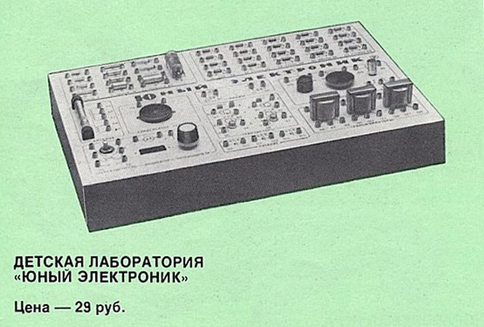 Радиоконструктор Детская лаборатория *Юный Электроник* выпускалась с 1977 года. Радиоконструктор *Юный Электроник* предназначен для детей школьного возраста от 7 до 16 лет, позволяя им ознакомиться с работой различных полупроводниковых схем, таких как усилители НЧ, радиоприёмные устройства, генераторы и многих других.