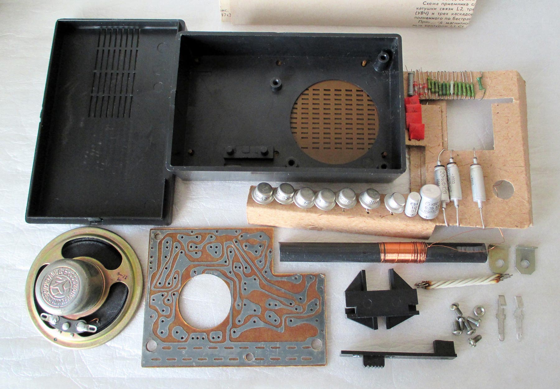 Радионабор *Юный Техник-2* (ЮТ-2) выпускался с 1986 года Грозненским радиозаводом. Радионабор представляет собой комплект основных узлов, деталей и радиоэлементов, дающих возможность собрать карманный радиоприёмник прямого усиления. Источником питания служит батарея «Крона», акустическим воспроизводителем - громкоговоритель типа 0,1 ГД-6. Приёмник собирается на 7-ми транзисторах и 3-х диодах по схеме прямого усиления. Номинальная выходная мощность радиоприёмника 60 мВт, а чувствительность вполне достаточна для работы в диапазоне средних волн (525-1605 кГц). Ток потребления при этой мощности ~ 30 мА. В наборе нет КПЕ С1, потеряли или изначально не было. Аналогичный корпус для сборки радиоприёмника выпускался с 1963 года, возможно так же Грозненским радиозаводом, но назывался он *ЮТ*.