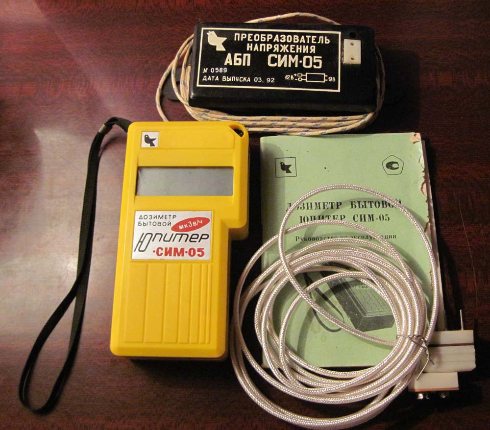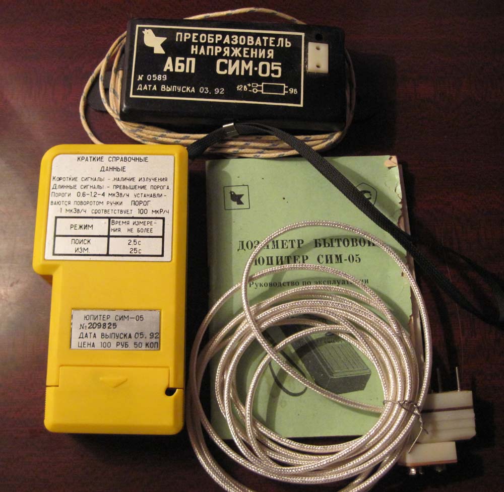 Дозиметр бытовой *Юпитер* (Сим-05) выпускался с 1990 года Киевским заводом *Радар*. Предназначен для оценки уровня мощности эквивалентной дозы гамма-излучения с помощью звуковой сигнализации, показаний на цифровом табло и извещении продолжительным звуковым сигналом о превышении порога по МЭД. Диапазон энергий 0,06...1,25 МэВ. Предельно допустимое облучение 10 (1000) мЗвч (мРч). Диапазон оценки МЭД в режиме ИЗМ - 0,05...99,99 мкЗвч (мкРч), в режиме ПОИСК - 0,1...999,9 мкЗвч (мкРч). Масса дозиметра - 0,25 кг.