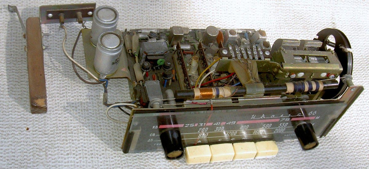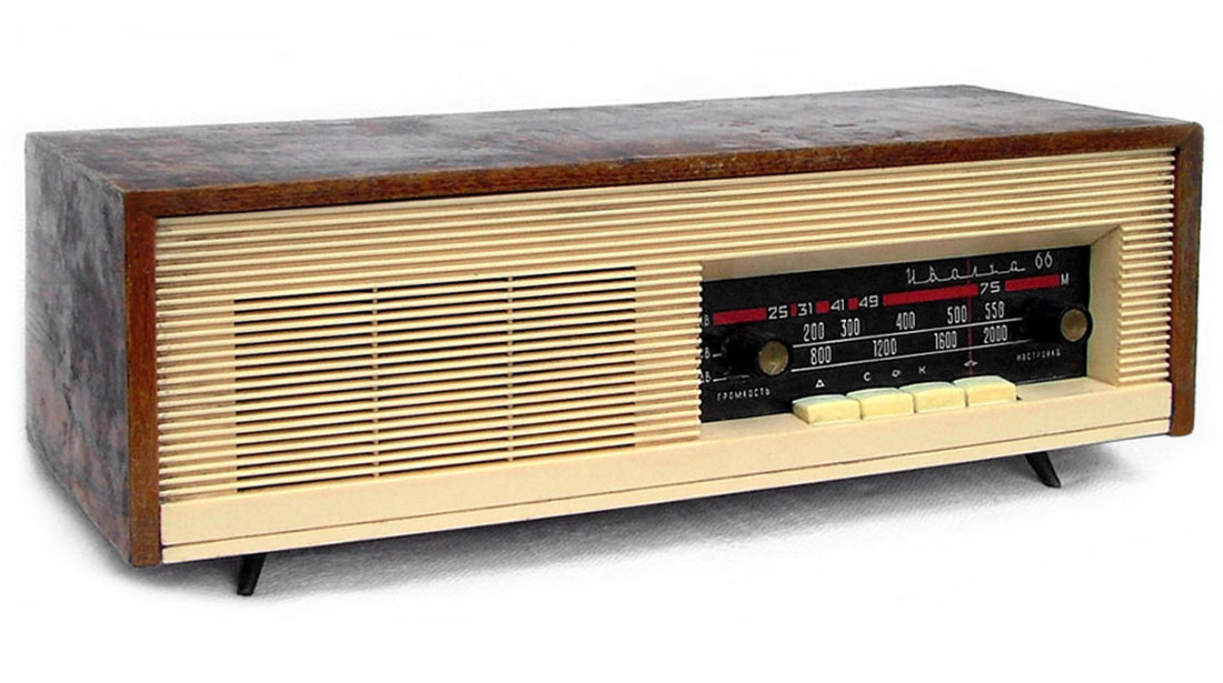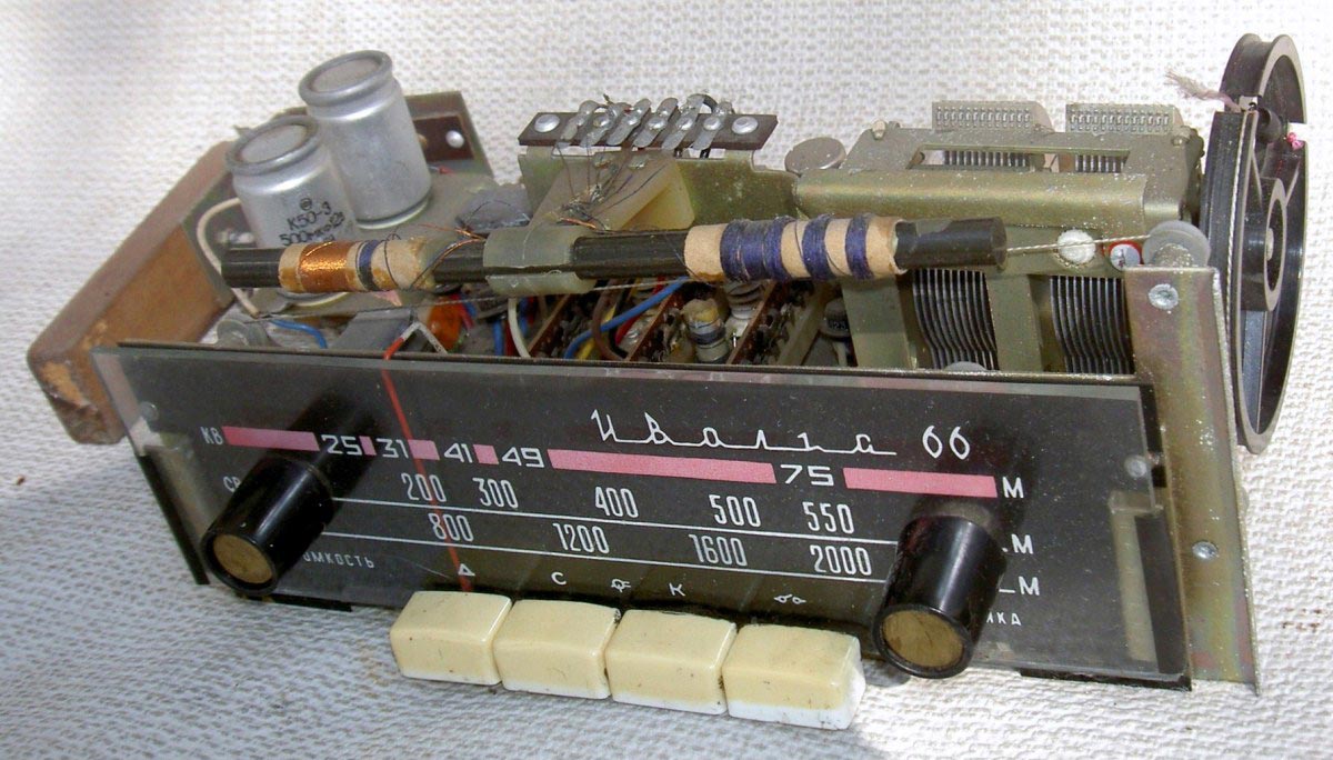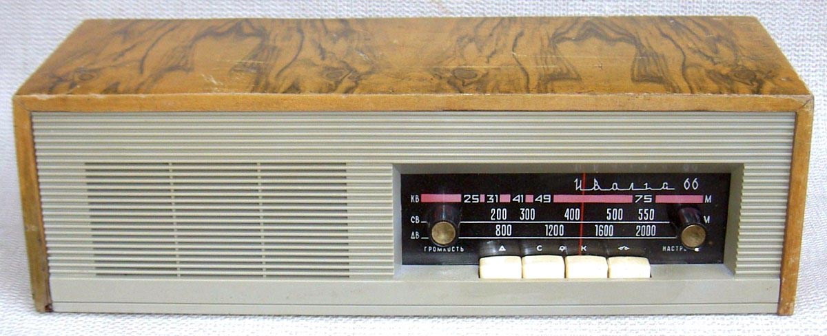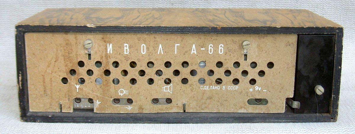 Стационарный транзисторный радиоприёмник *Иволга-66* с I-кв 1966 года выпускал Минский радиозавод. Радиоприёмник третьего класса **Иволга-66** - это один из самых малогабаритных настольных радиоприёмников для своего времени с диапазонами ДВ, СВ и обзорным КВ: 24...75 м. В приёмнике имеется вход для адаптера электропроигрывателя и выход для выносного громкоговорителя. Питание приёмника осуществляется от шести батарей 373 или четырёх батарей КБС-Л-0,5 или сетевой приставки ВП-65. Диапазоны: ДВ 2000...735,3 м. СВ 571,4...186,9 м. КВ 75,9...24,8 м. Чувствительность на магнитную антенну в диапазоне ДВ - 2,0, СВ - 1,0 мв/м. Чувствительность на наружную антенну в диапазоне КВ 150 мкв. Селективность 26 дб. Полоса воспроизводимых частот - 150...3500 гц. Габариты приёмника 345х170х190 мм. Вес с батареями 4,0 кг. Цена радиоприёмника с комплектом питания из шести элементов типа 373 - 50 рублей 34 копейки. Радиоприёмник **Иволга-66** выпускался с 1966 по 1969 год включ. и был достаточно популярным.
