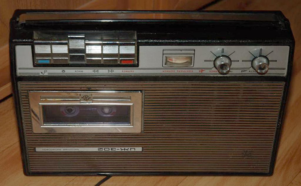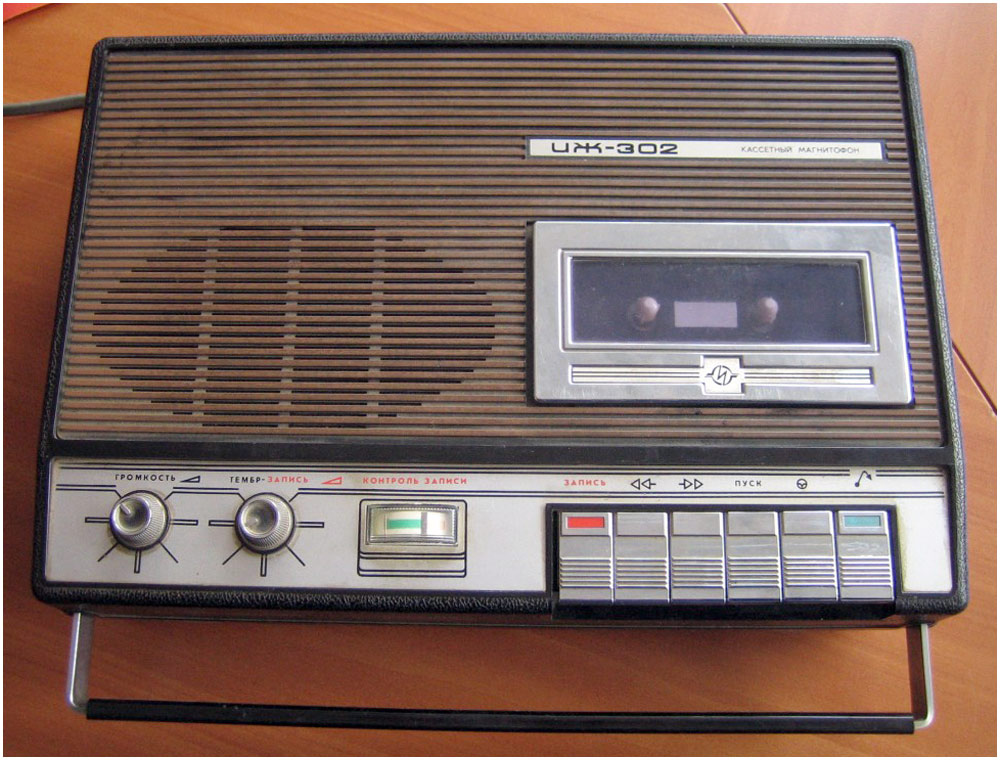Кассетный магнитофон *ИЖ-302* с I-кв 1982 года выпускал Ижевский мотозавод. Магнитофон создан на базе магнитофона **Электроника-302**, учитывая модернизации. Он предназначен для записи или воспроизведения звука с применением кассет МК-60. Магнитофон **ИЖ-302** состоит из трёх основных узлов, размещенных в пластмассовом корпусе: ЛПМ, усилителя ЗЧ и вкладываемого БП. Магнитофон позволяет производить запись с микрофона МД-64М, радио или телевизора, усилителя ЗЧ, радиолинии, электрофона и другого магнитофона; воспроизведение через встроенный громкоговоритель, усилитель ЗЧ, внешнюю АС, головные телефоны. Контроль уровня записи производится с помощью стрелочного индикатора. При воспроизведении и перемотках индикатор показывает напряжение питания. Магнитофон обеспечивает временную остановку носителя. Кнопка, расположенная на микрофоне дистанционно управляет включением магнитофона, что дает возможность использовать его в репортёрских целях. Время работы от комплекта свежих элементов А-343 ~ 10 часов. Напряжение питания: постоянного тока 9 В, переменного 220 В. Число дорожек записи 2. Скорость движения ленты 4,76 см/сек. Рабочий диапазон частот 63 ...10000 Гц. Время записи и воспроизведения на кассете МК-60 - 2х30 мин. Коэффициент детонации 0,35%. Относительный уровень шумов и помех в канале ЗВ -46 дБ. Диапазон регулировки тембра по ВЧ -10 дБ. Номинальная выходная мощность от батарей 0,7 Вт. Габариты модели 90x318x225 мм. Вес с кассетой и элементами 3,2 кг.