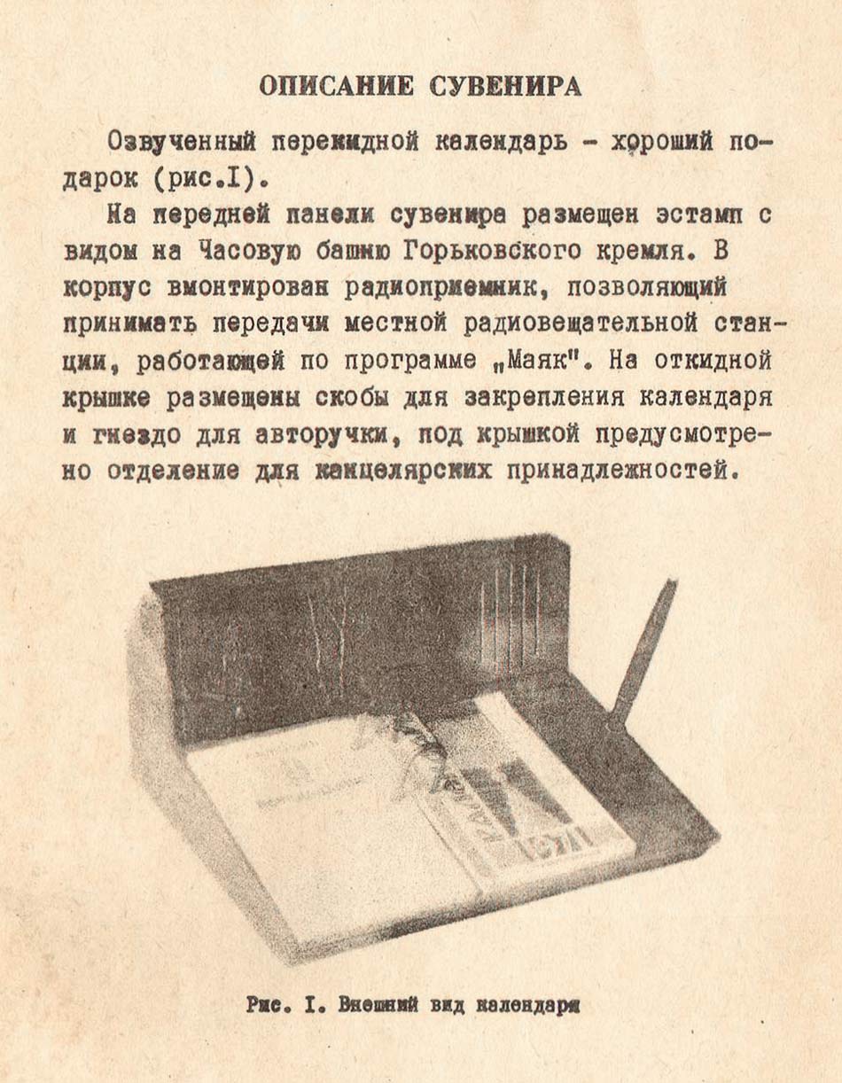 Озвученный перекидной календарь выпускался с 1980 года. Перекидной календарь со средневолновыи радиоприёмником прямого усиления. Собственно вся информации в приведённом описании и электрической схеме. Фото, описание и электрическую схему календаря прислал Юрий Билоконь, Черкассы.